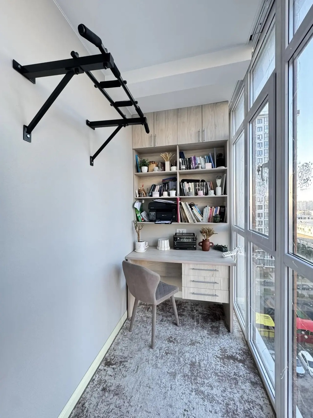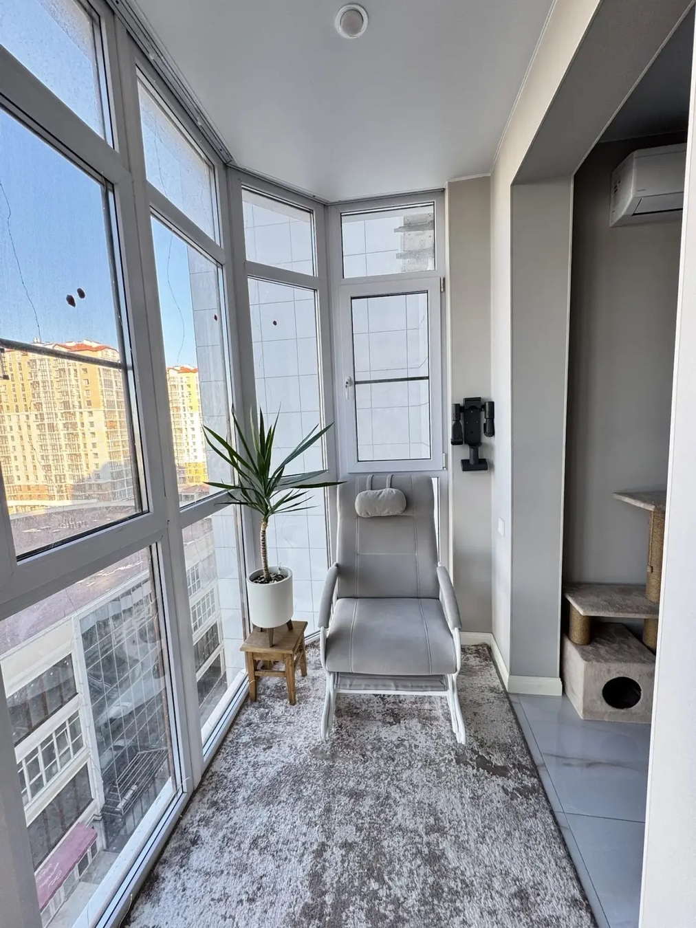 Кухня-гостиная с выходом на панорамный балкон. Пространство организовано так , что рабочая кух зона отделена от гостиной чтоб избежать запахов от приготовления. Имеется гардеробная комната. В балконной зоне организовано рабочее пространство для работы с компьютером.