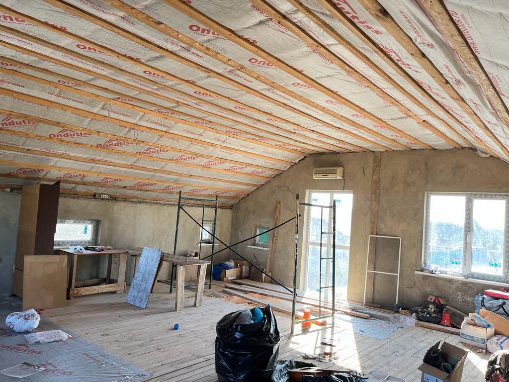 Крыша утеплена, скат крыши позволяет планировать полноценные комнаты. Имеется разводка под сан.узел, есть сплит-система. Панорамное остекление.