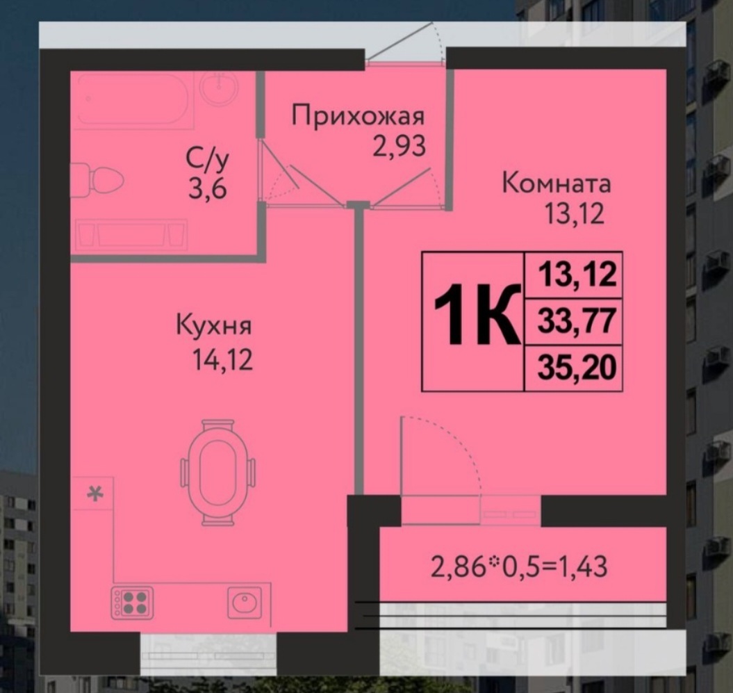 Квартира удобной планировки Евро 1 комн. Кухня гостиная 14 кв.м.