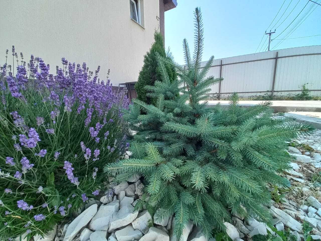 На участке растут: розы, голубая ель, можжевельники, сосна, пихта, лаванда. Плодовые: черешня, груша, яблони, абрикос, персик, чернослив, инжир, гранат.