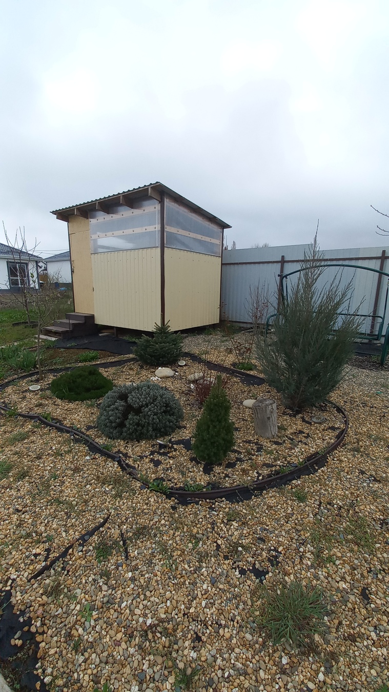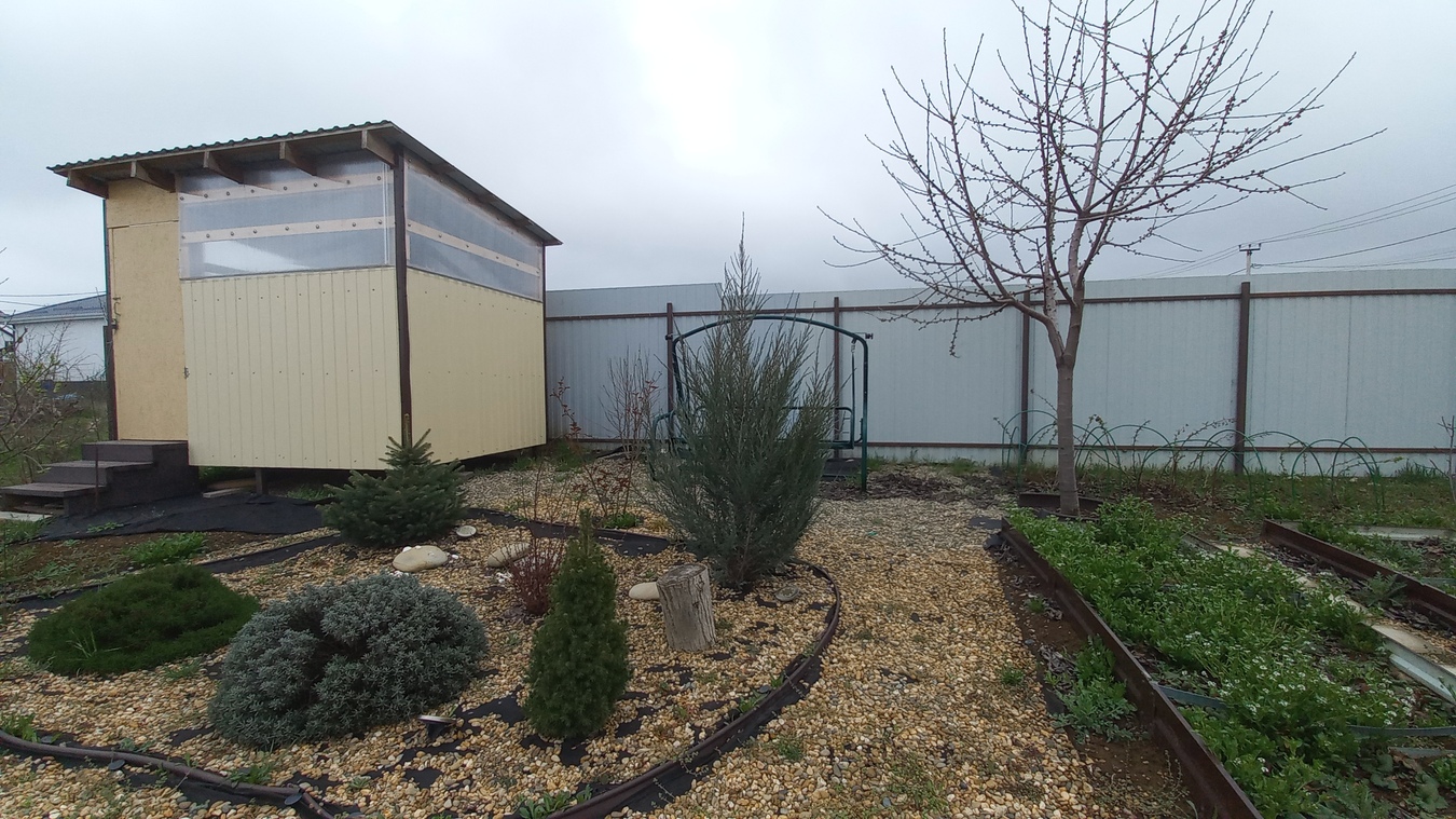 На участке растут: розы, голубая ель, можжевельники, сосна, пихта, лаванда. Плодовые: черешня, груша, яблони, абрикос, персик, чернослив, инжир, гранат.
