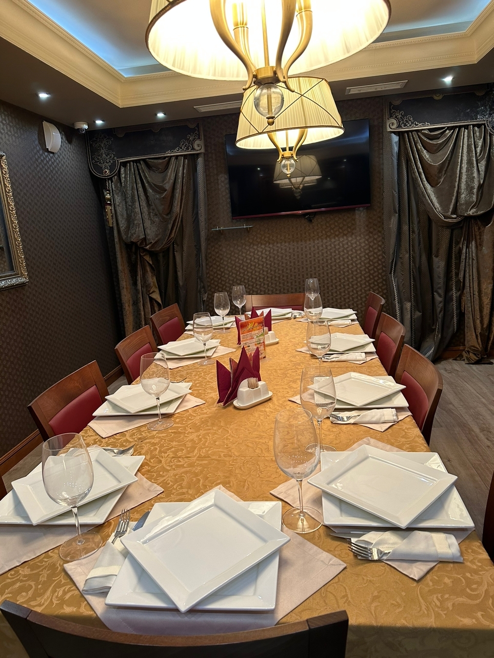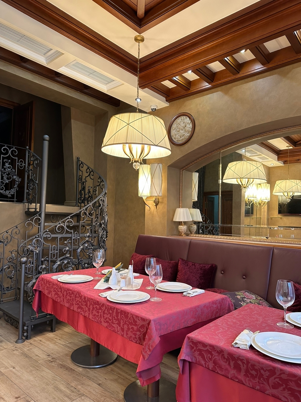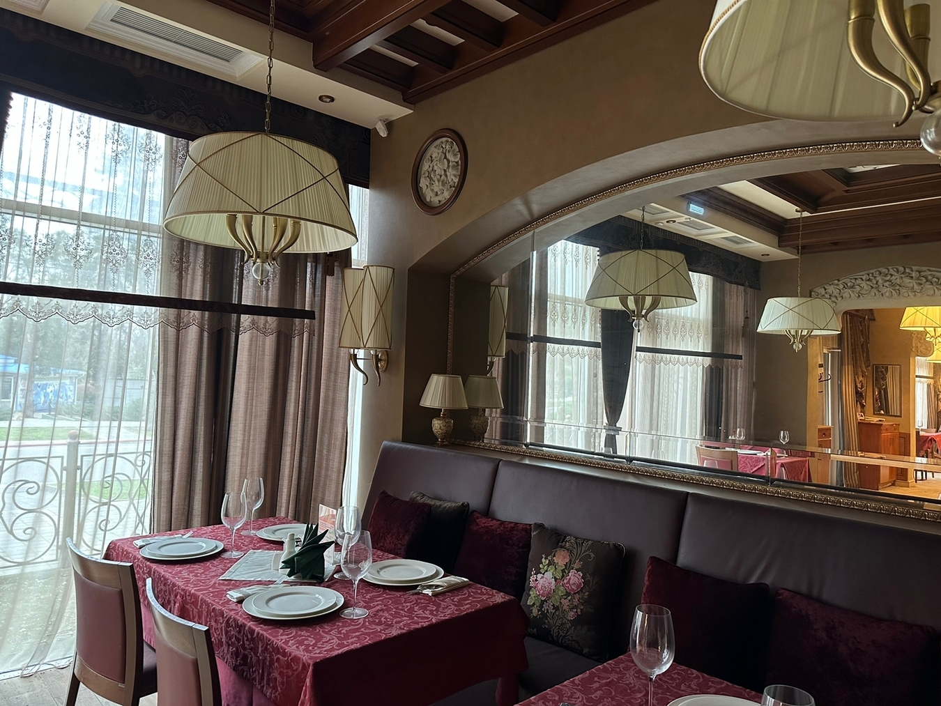 Всего три зала: основной, банкетный и кафетерий с отдельным входом и собственной кухней (может работать автономно от ресторана).
