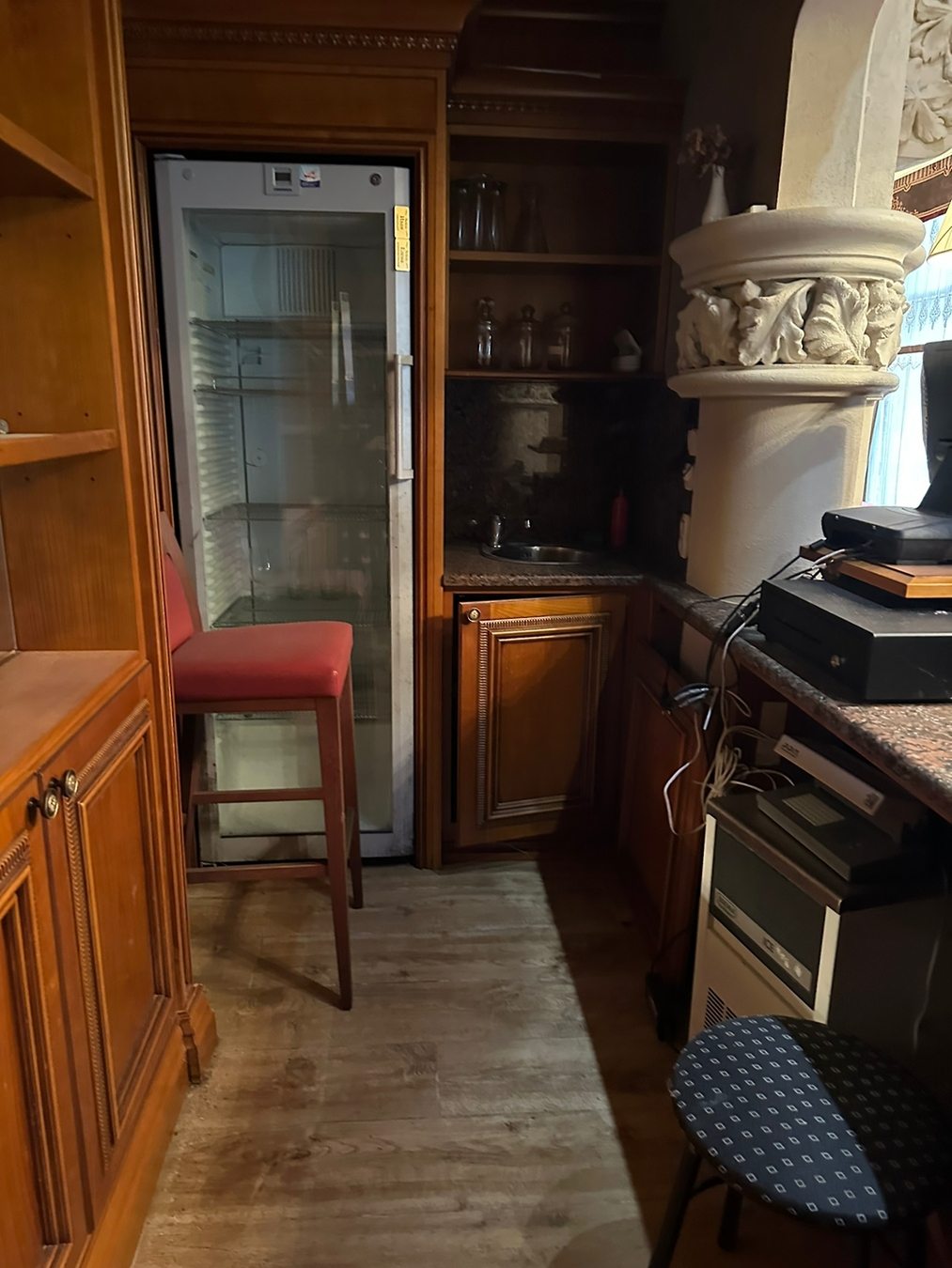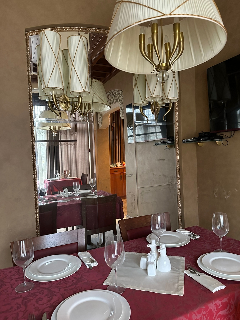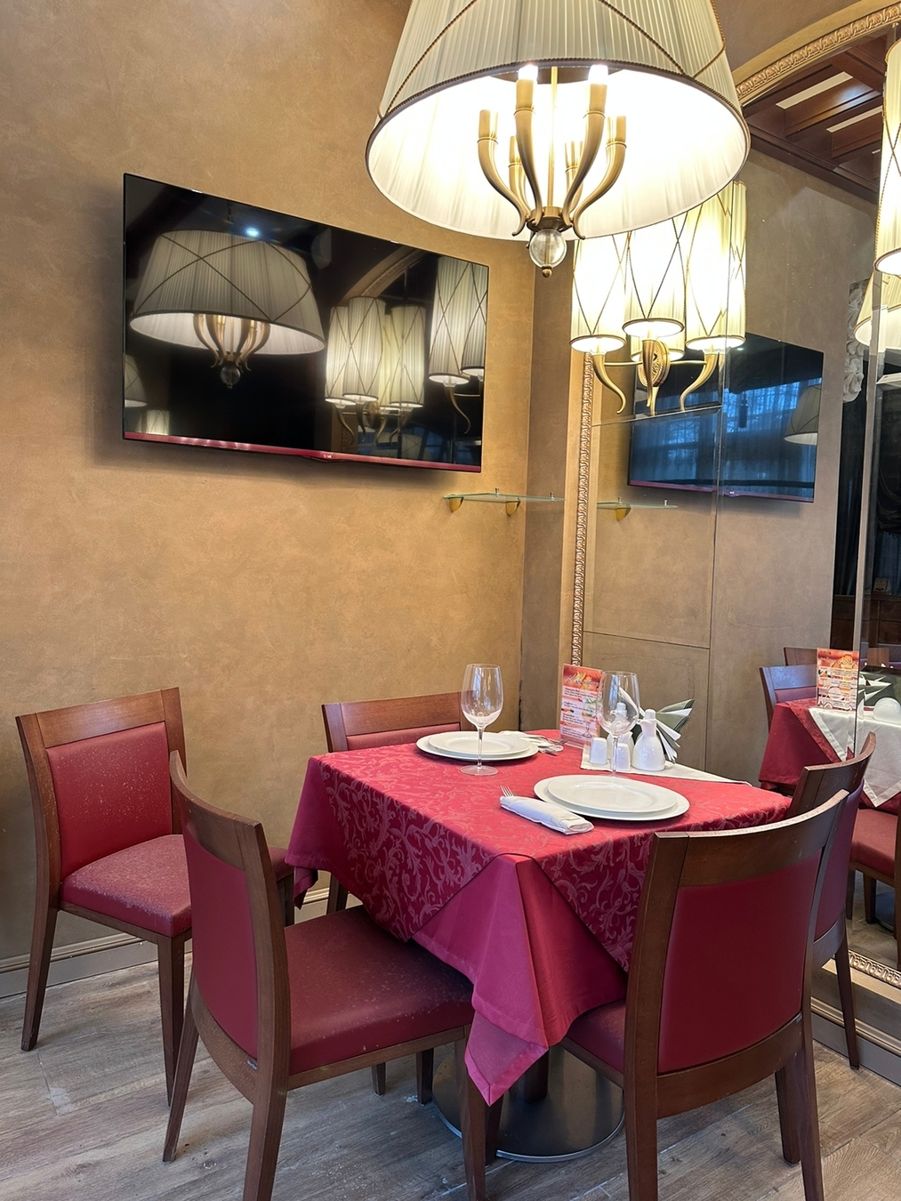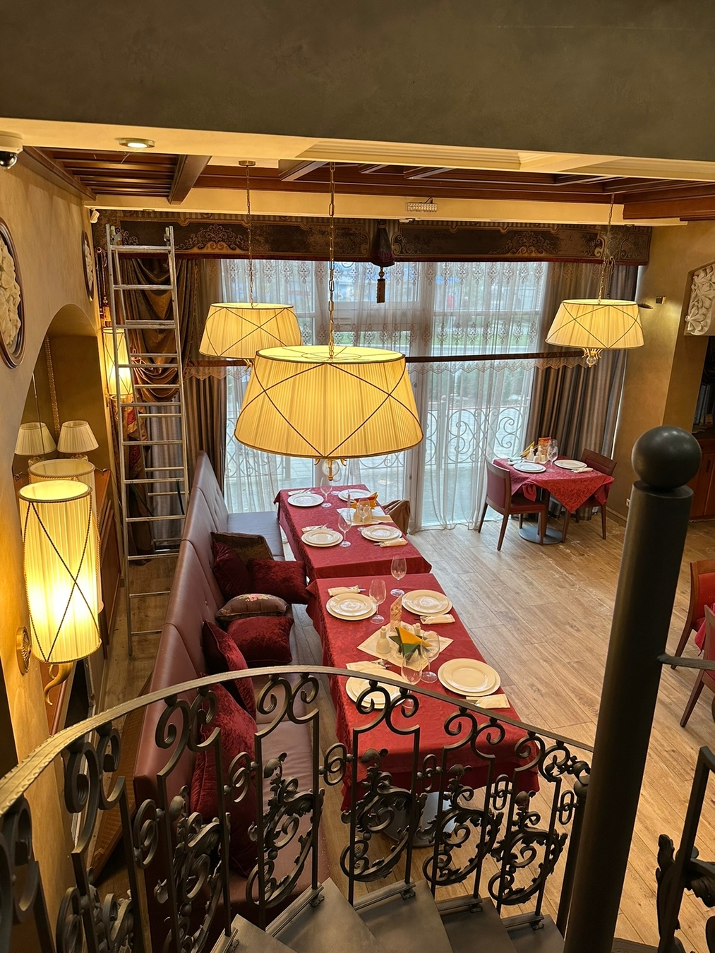 Всего три зала: основной, банкетный и кафетерий с отдельным входом и собственной кухней (может работать автономно от ресторана).