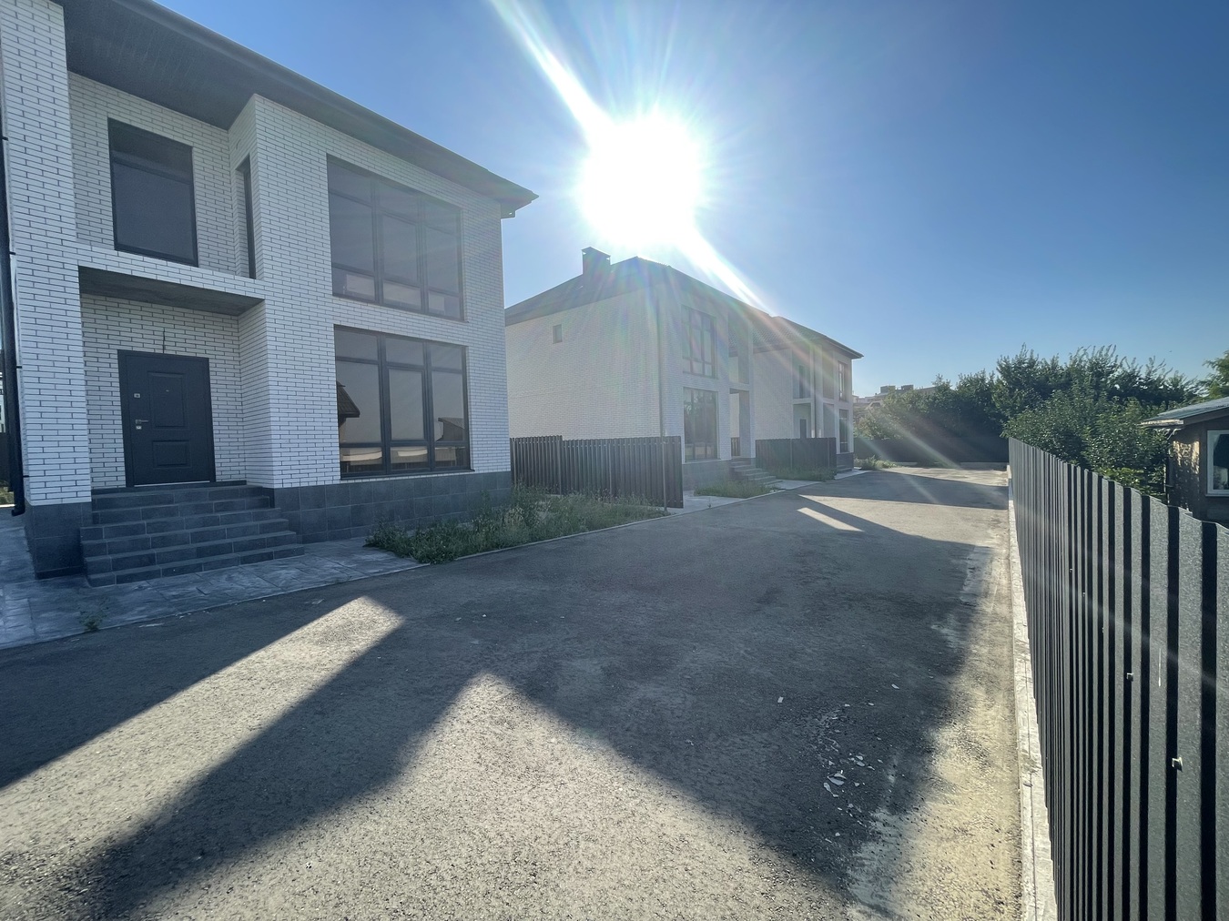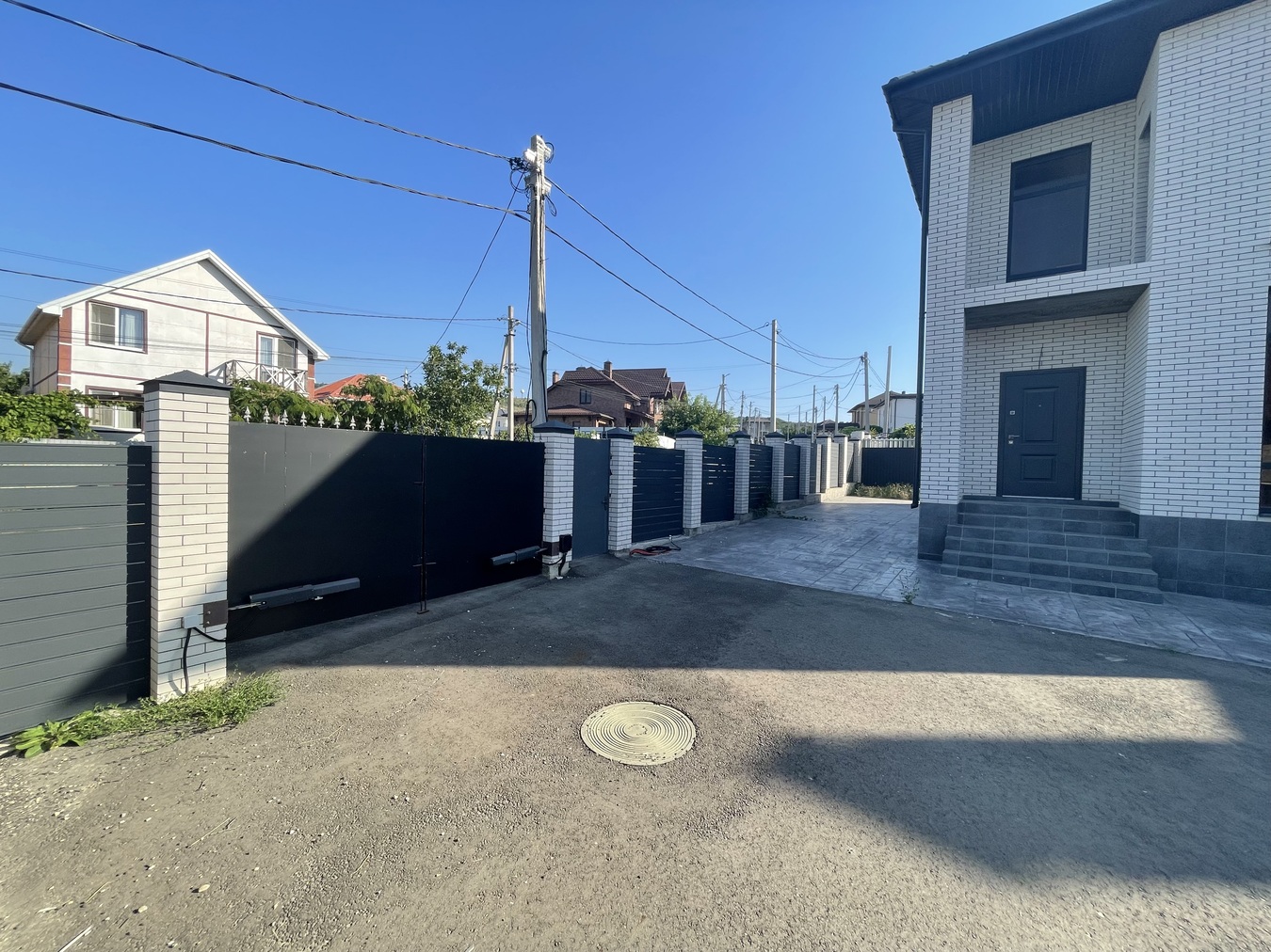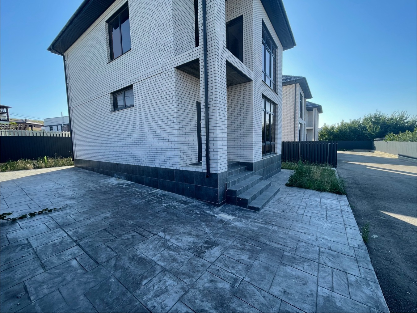 Участок облагорожен печатным бетоном, есть машиноместо, капитальный забор