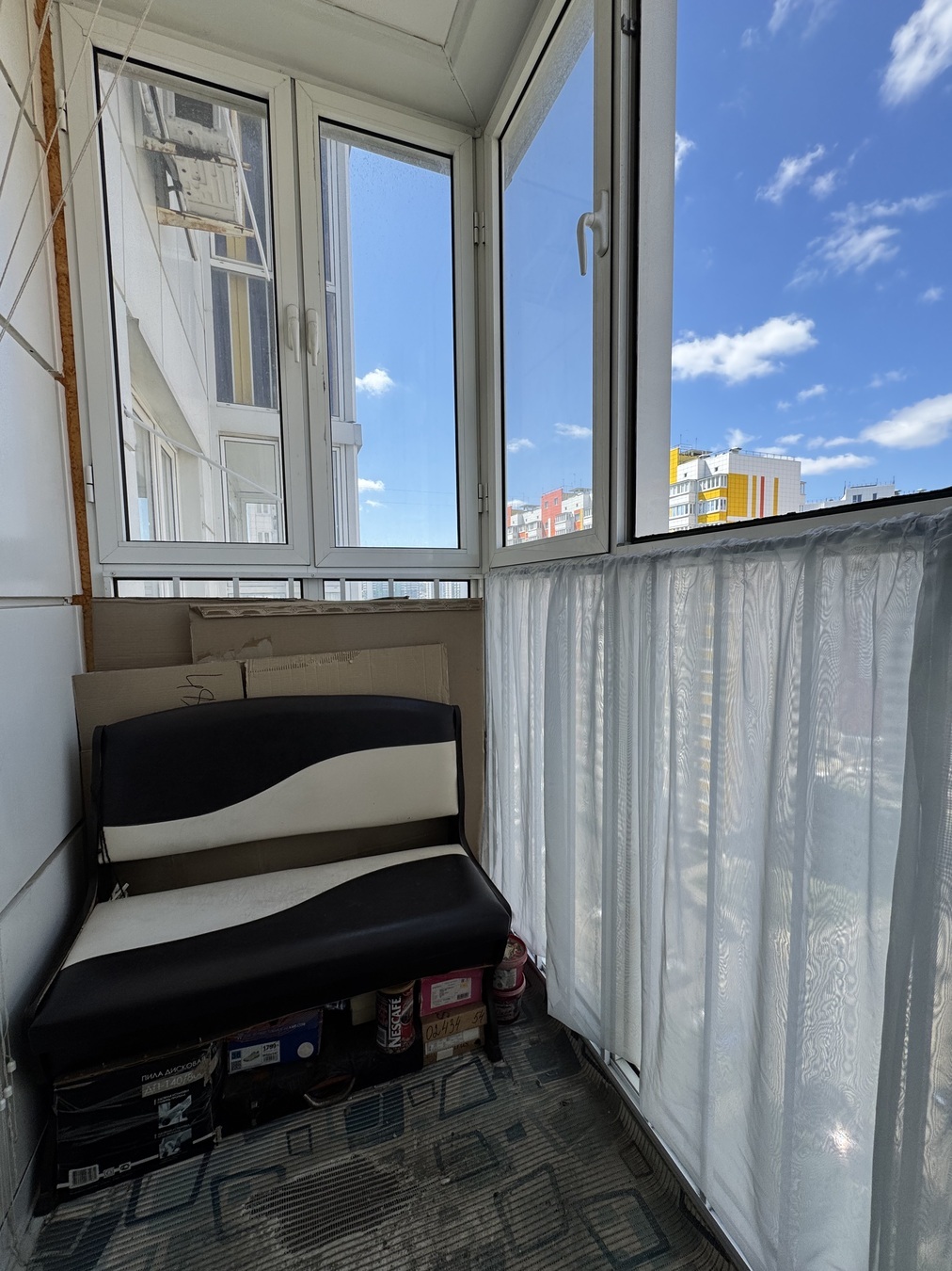 Просторный балкон с панорамными окнами на котором можно разместить кабинет,дополнительное спальное место .