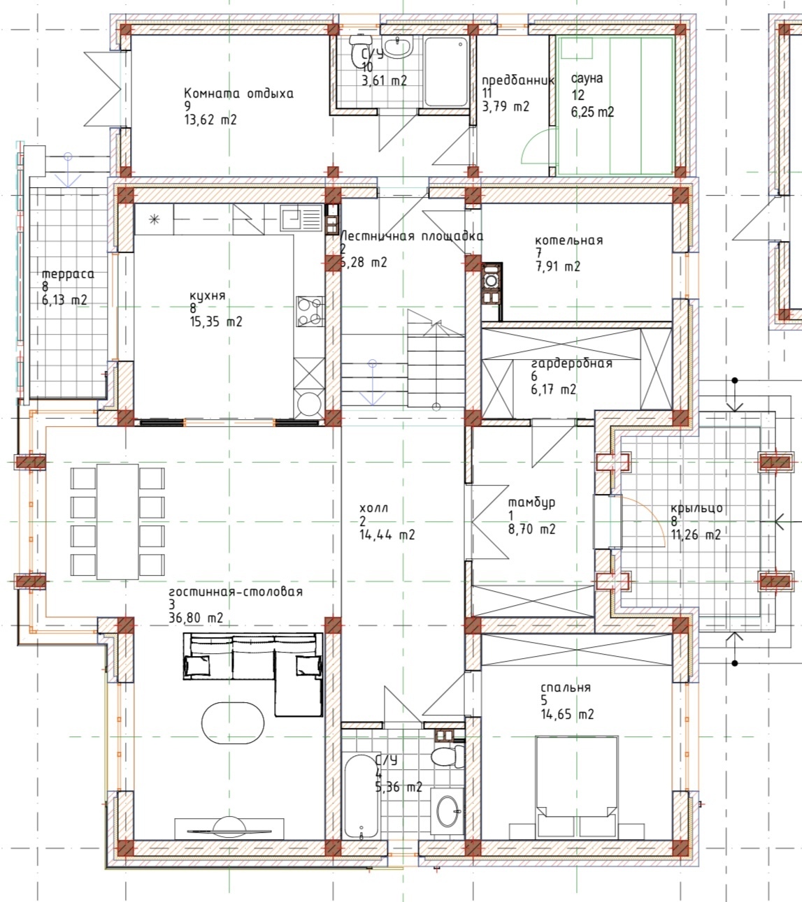 - большая кухня-столовая с выходом на задний двор — идеальное место для отдыха и приёма гостей;