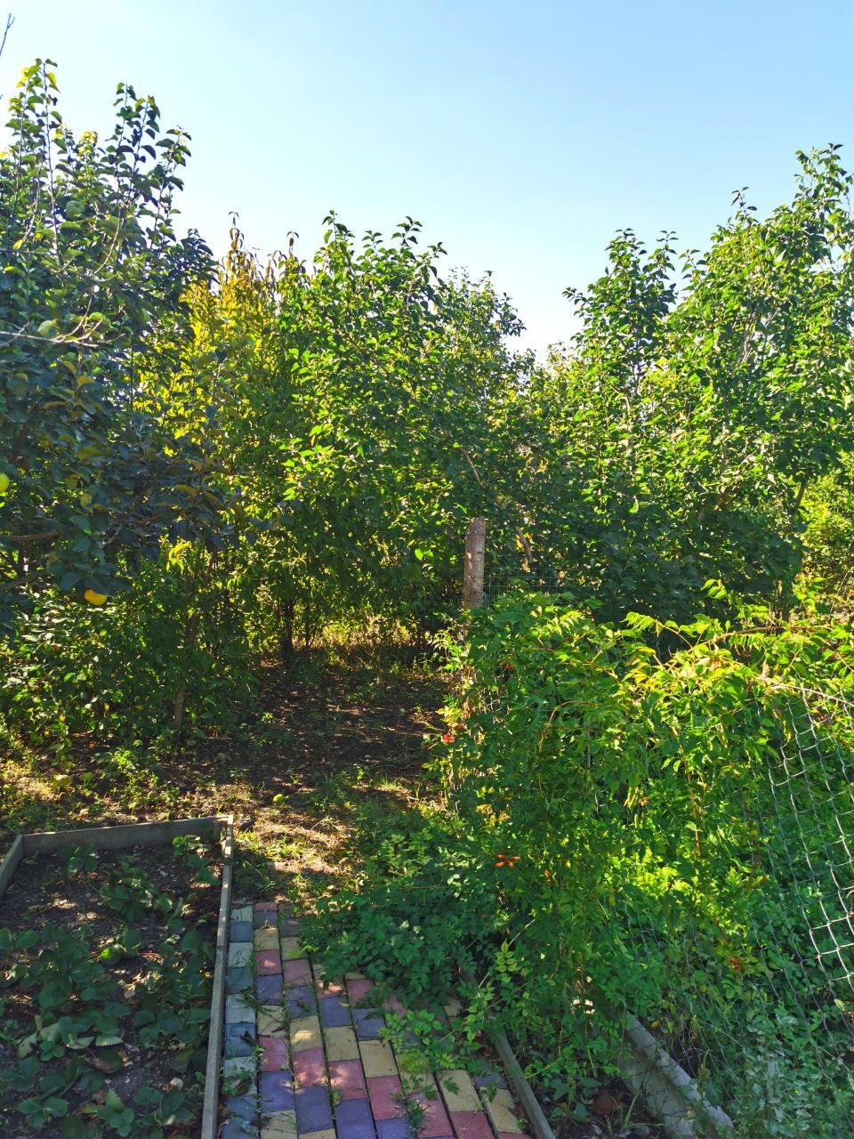 В саду очень много фруктовых деревьев, кусты малины и смородины.