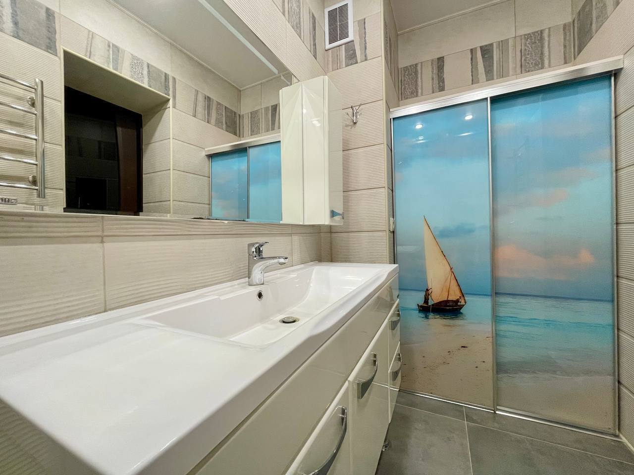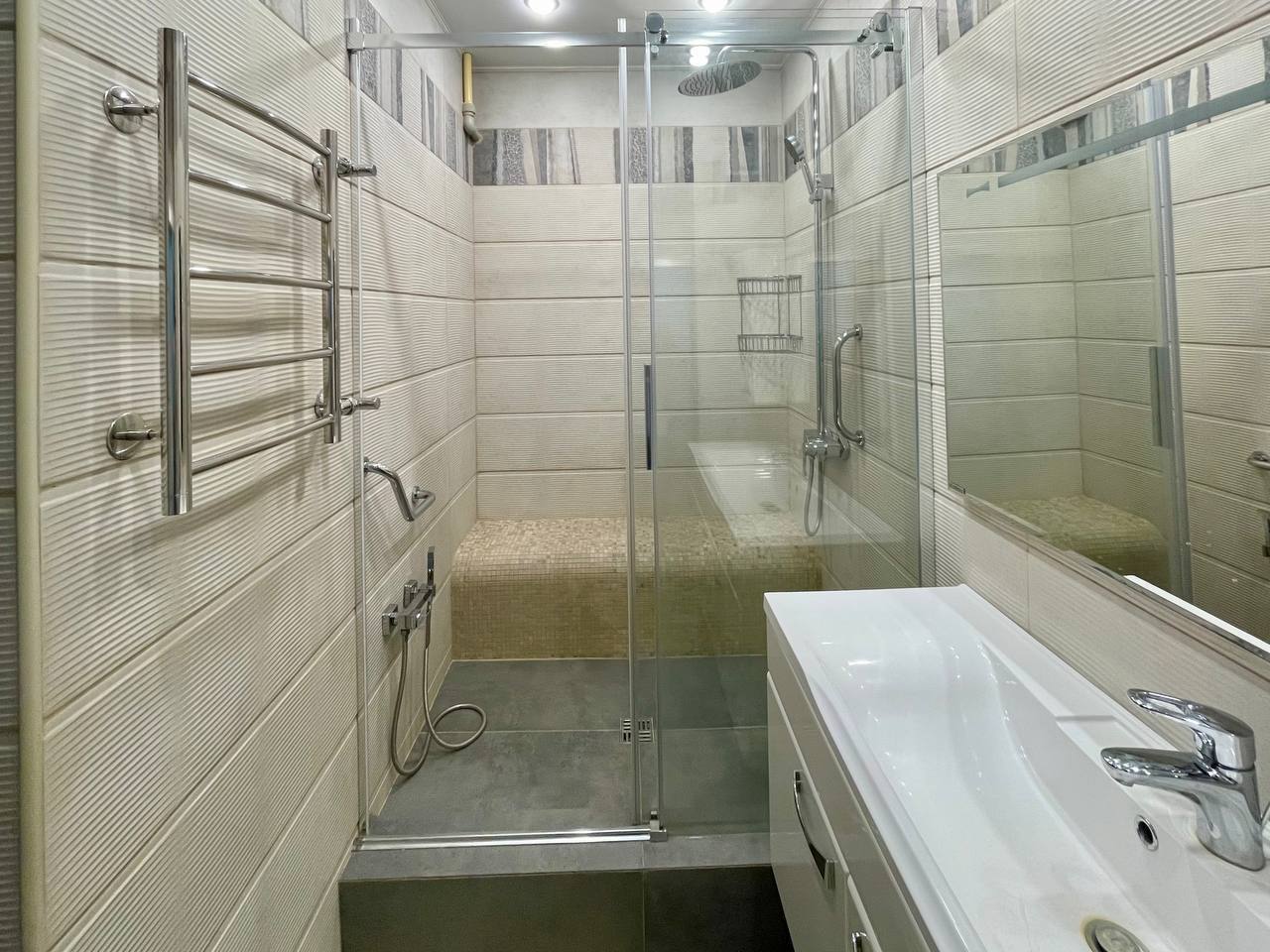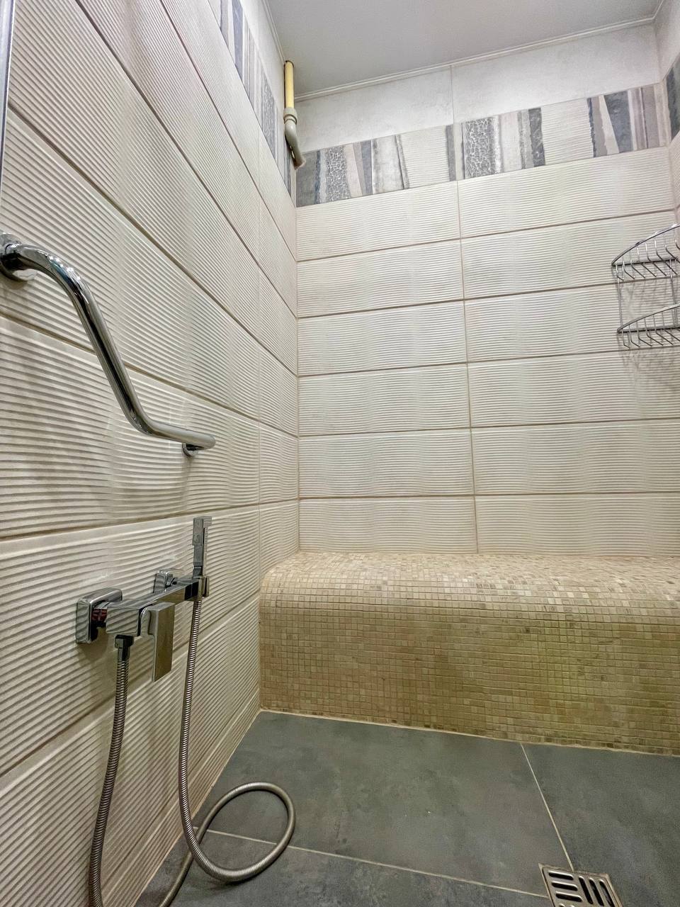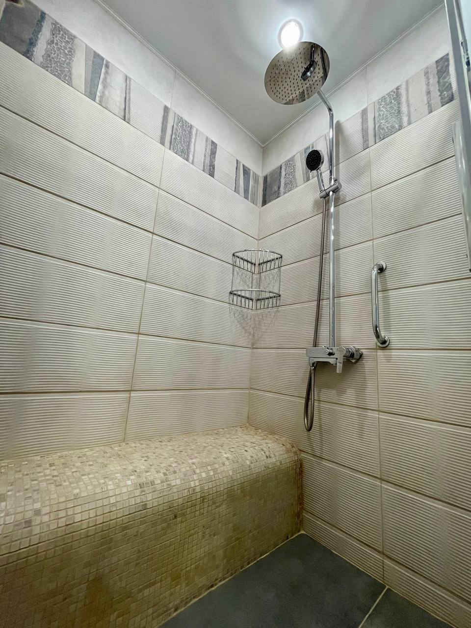 👍Санузел выполнен по индивидуальному проекту. Выложена просторная душевая кабина с удобной лавочкой.