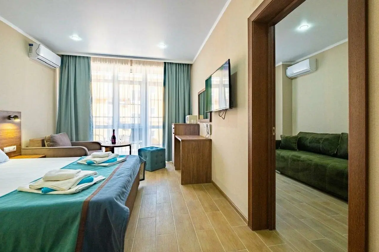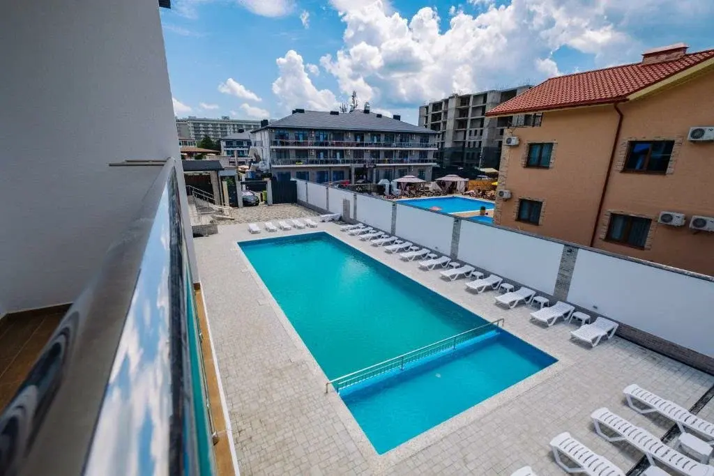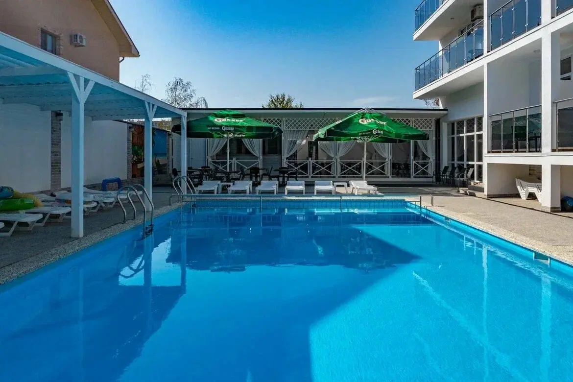 Действующий отель со своей инфраструктурой: бассейн с подогревом, летнее открытое кафе, детская площадка, зоны отдыха, парковка перед отелем.