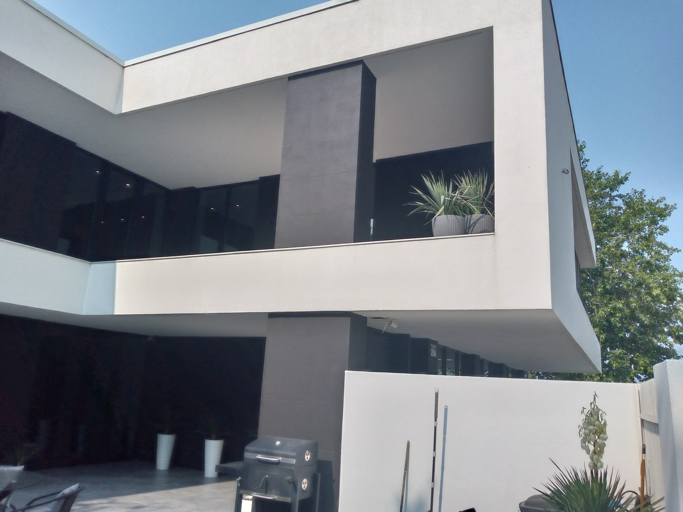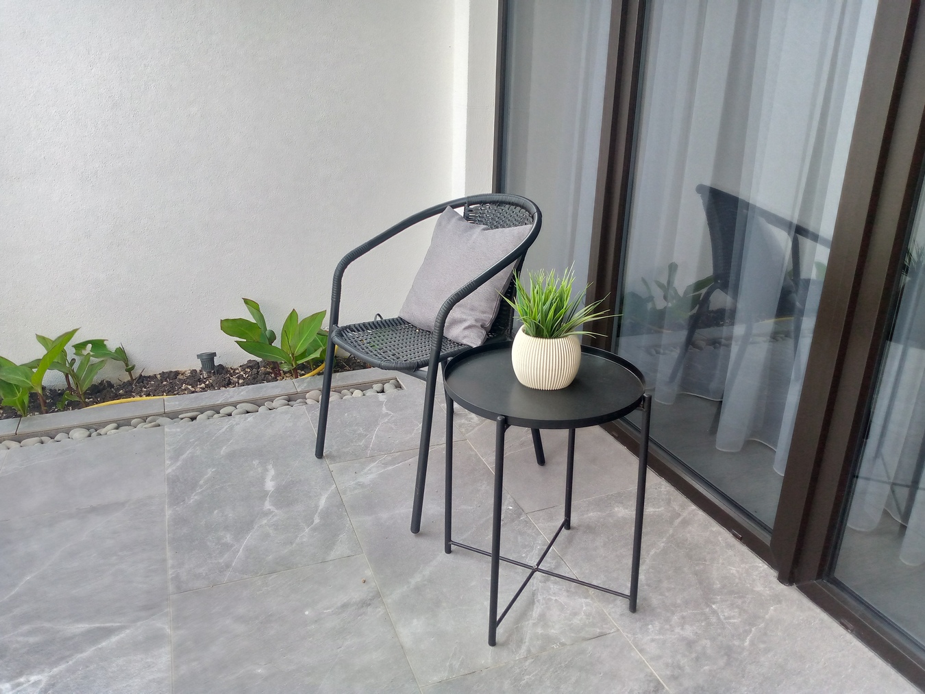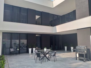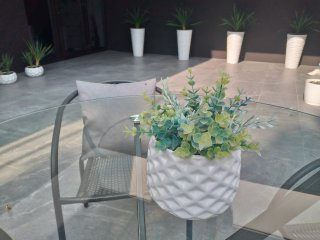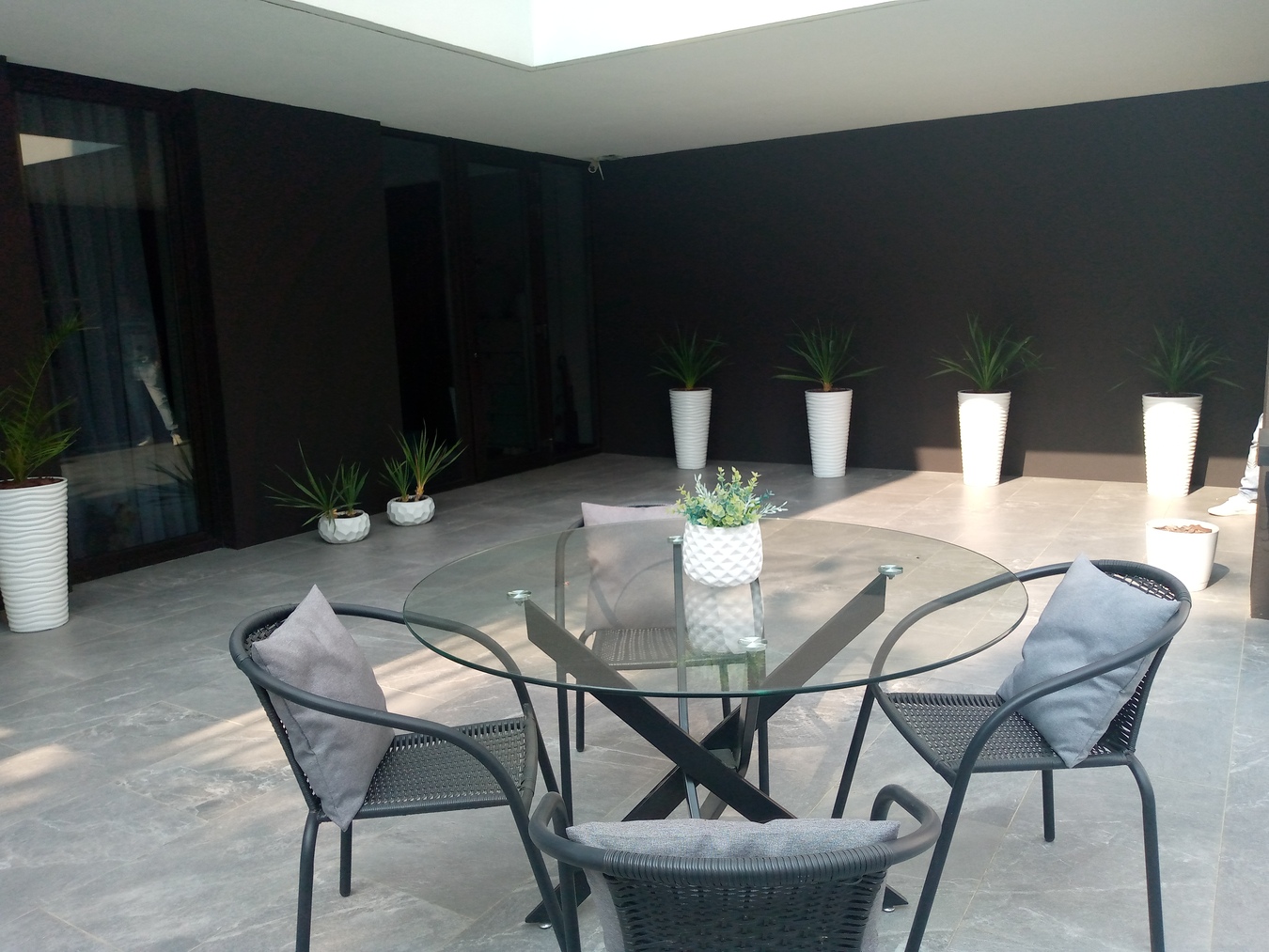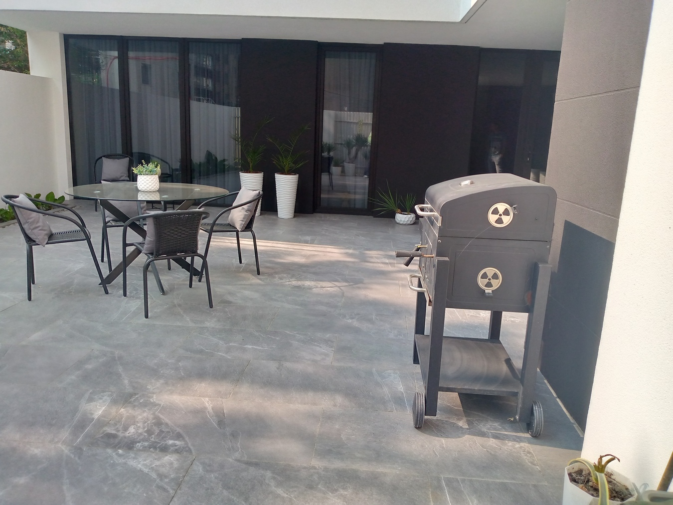 Внутренний дворик с включённой зоной барбекю, обеденным столиком и настольным камином.