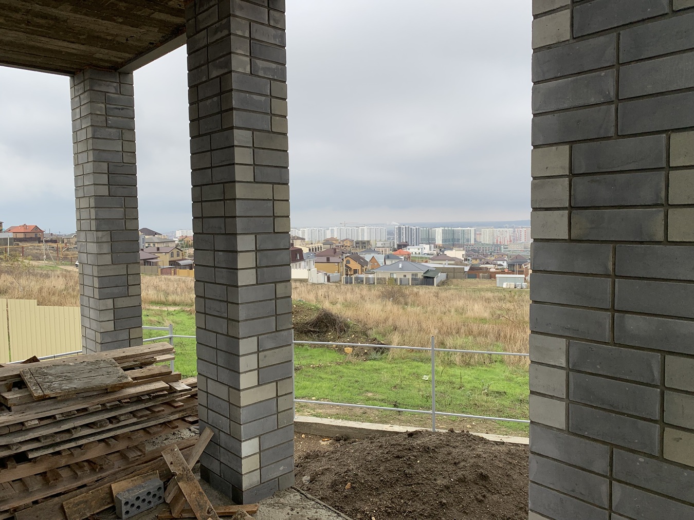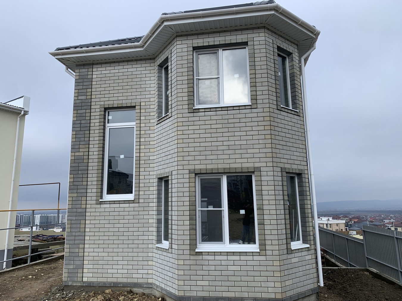 Монолитно блочный дом, внешние стены: блок, утеплитель, кирпич.