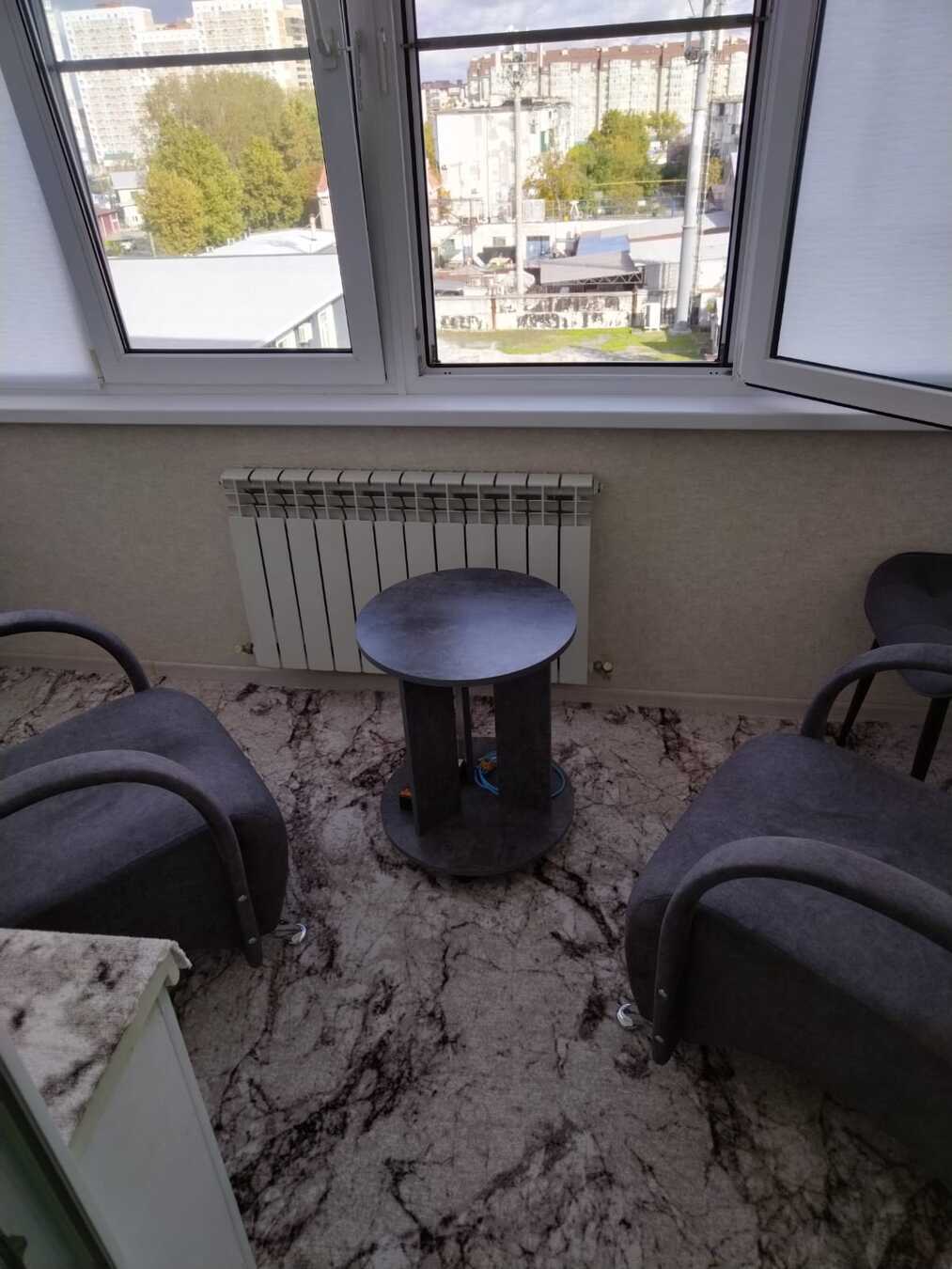 Отапливaемая лoджия, выход с кухни. Длинный балкон, выход с комнаты.