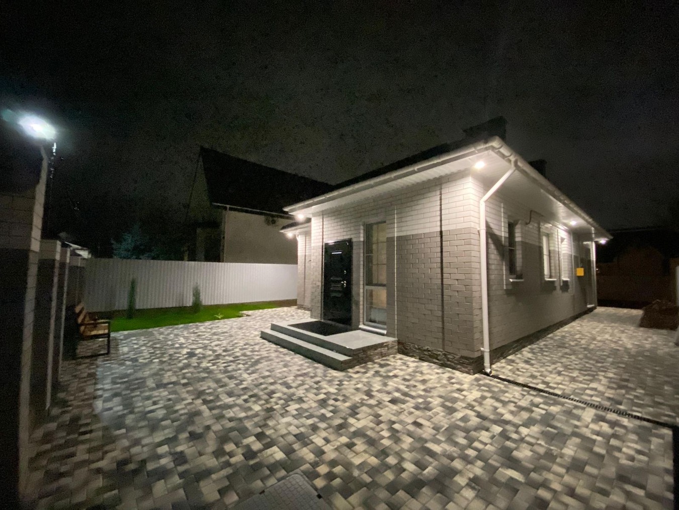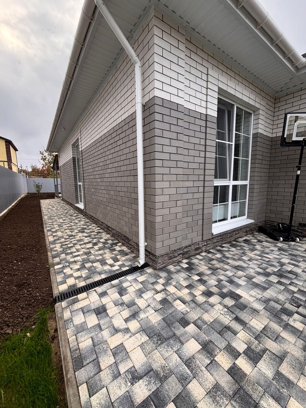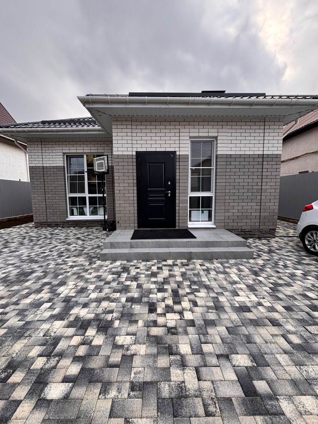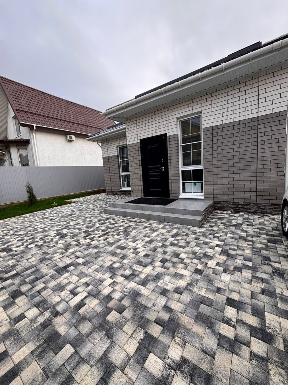 Перед домом место для нескольких автомобилей, все в плитке