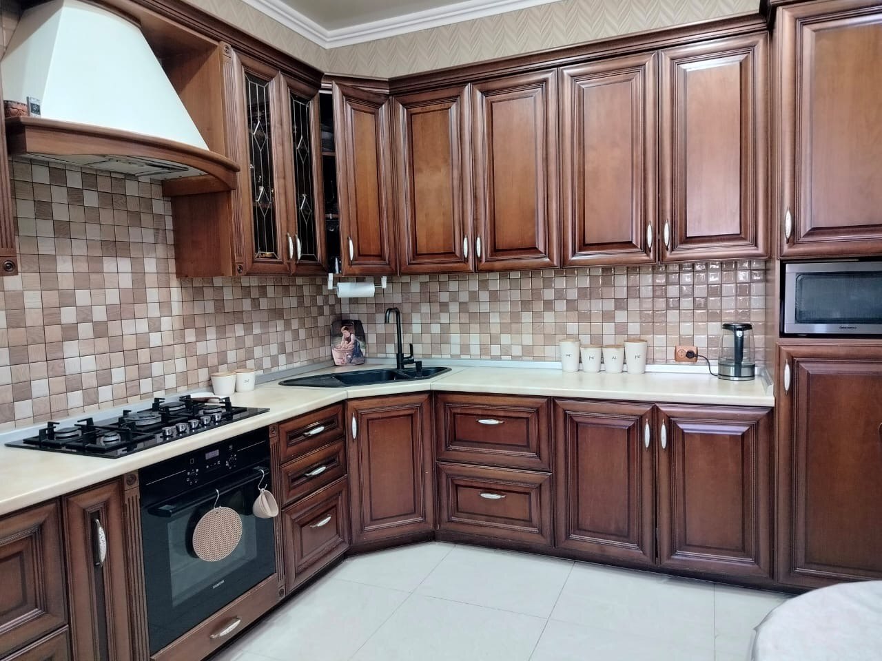 Кухня из натурального дерева оборудована современной техникой, создавая идеальное пространство для кулинарных экспериментов и уютных семейных вечеров.