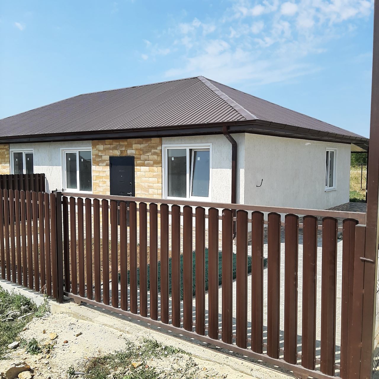 Двор: тротуарная плитка (дорожка к дому и парковочное место), навес, фасадный забор (металлоштакетник) с откатными воротами и калиткой. По периметру огражден сеткой.К