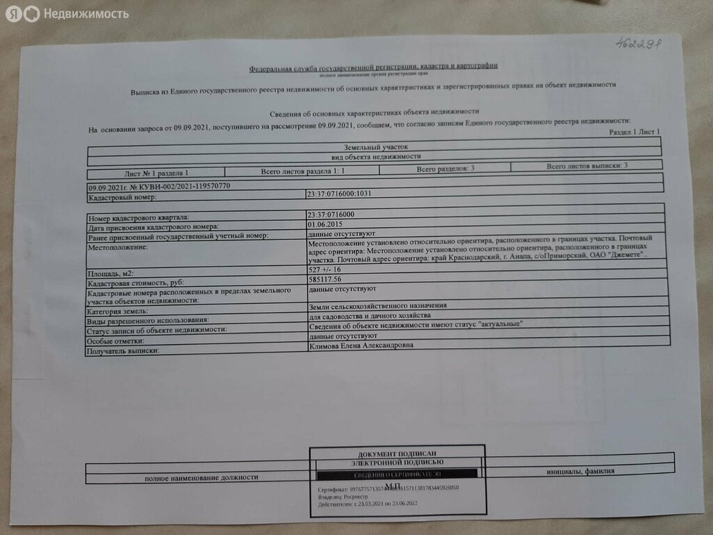 Участок Анапа,Верхнее Джемете,5.27 сот.Фасад 21×25 ,угловой возможно сделать выезд и вход с любой стороны.Подключено электричество 15кв.Участок на холме,хороший вид на море и Анапу.Есть возможность подключиться к центральному водопроводу,газ в перспективе.До жд вокзала пешком 10 минут ,до моря 3км по прямой.Земля сх 2 с правом возведения жилого дома и регистацией.Кадастровый номер 23:37:0716000:1031