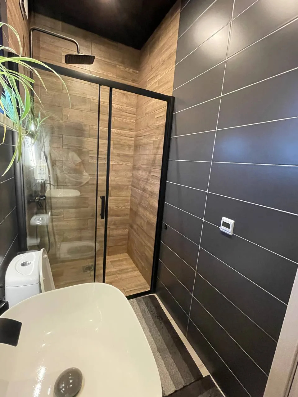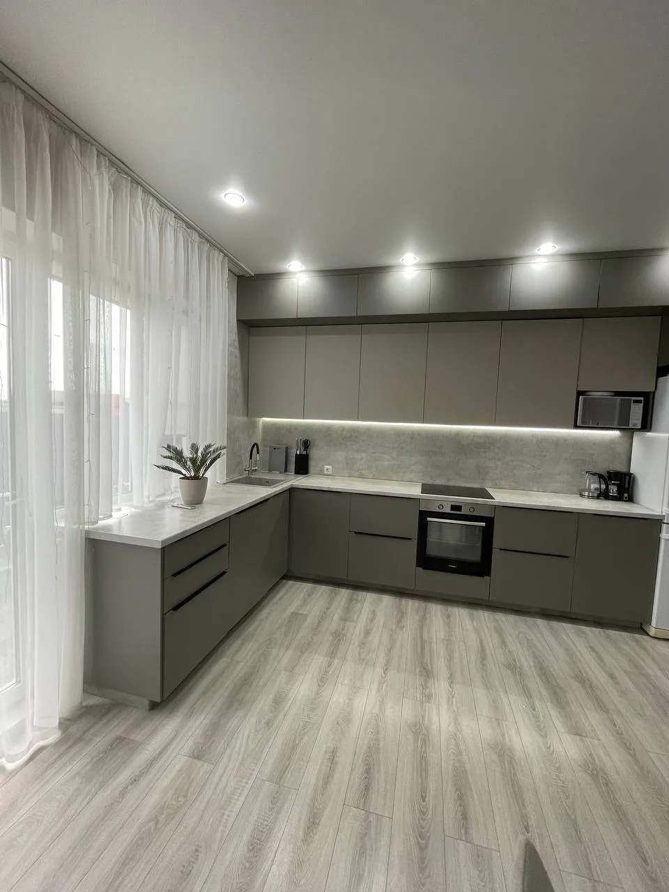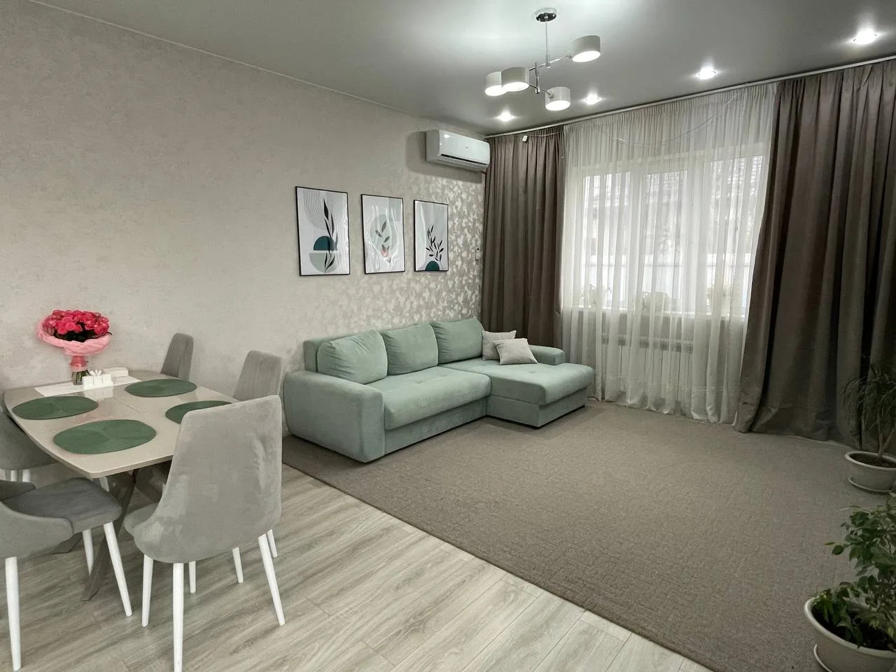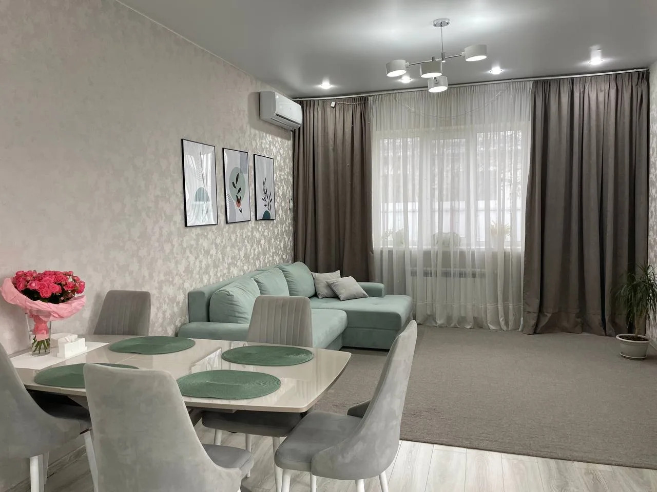 Дом :гардеробная,3 комнаты,одна из них мастер-спальня,санузел просторный и шикарная кухня-гостиная с выходом на террасу.