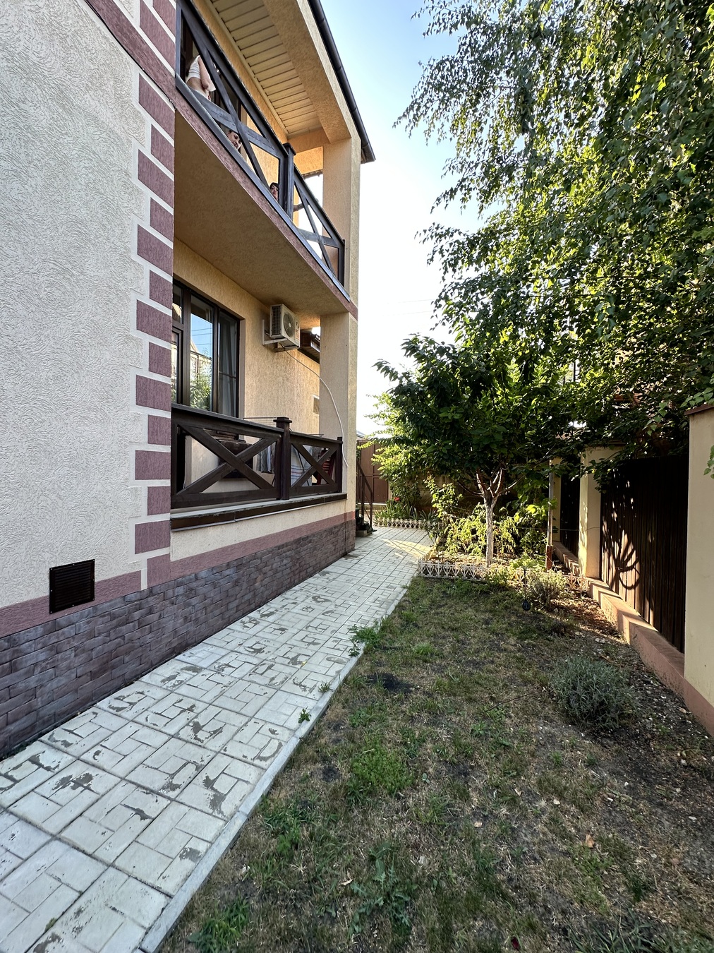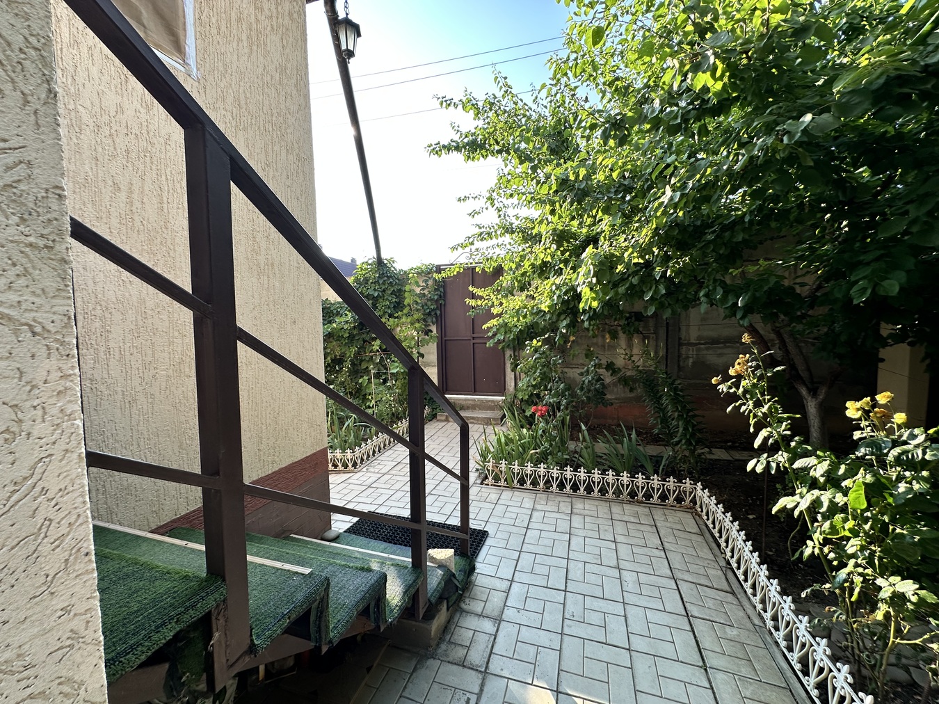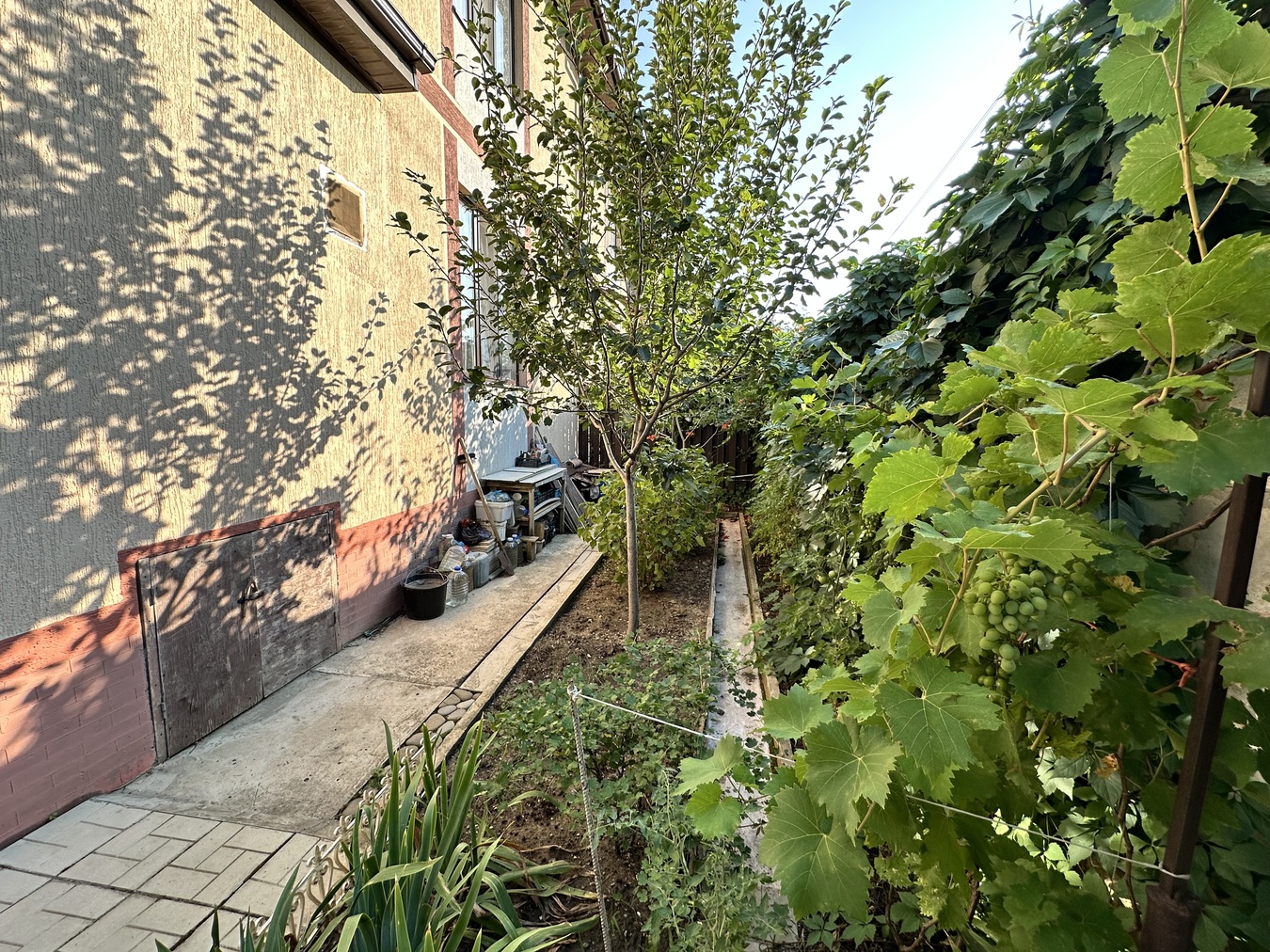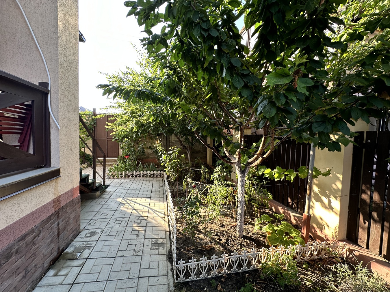 Ухоженная территория, плодовые деревья, кустарники, дорожки.