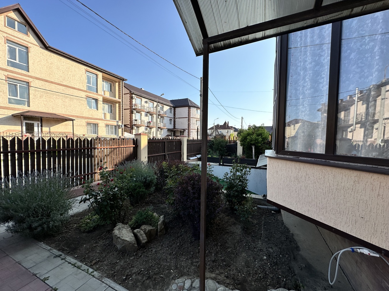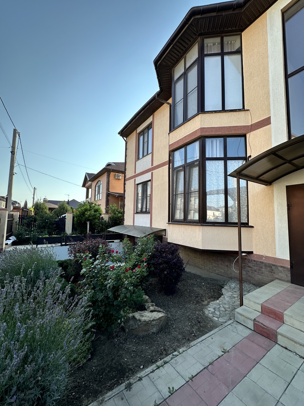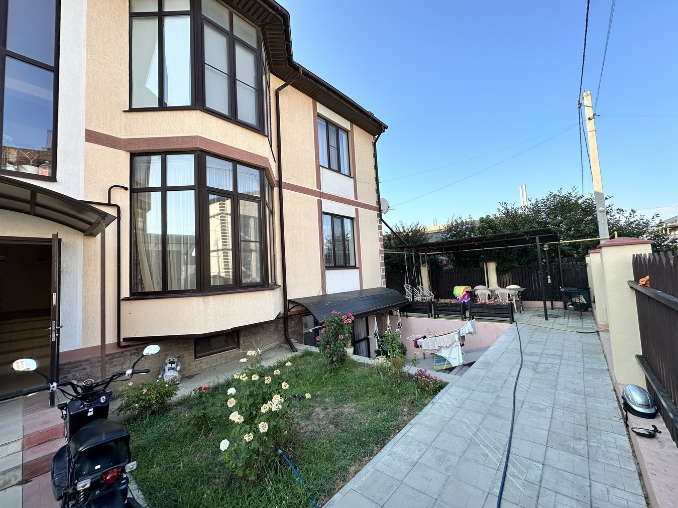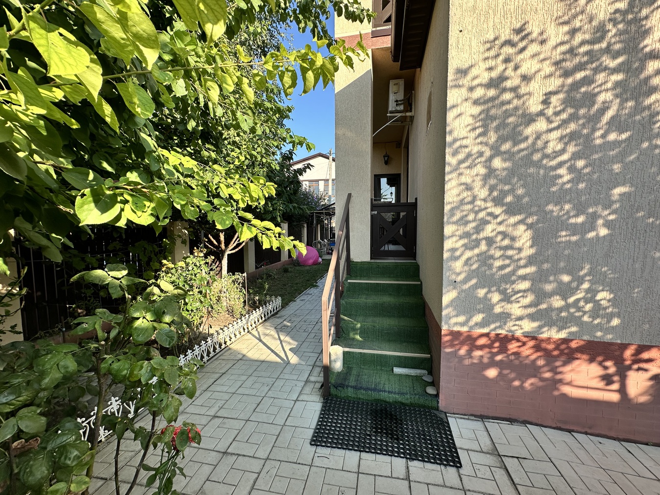 Ухоженная территория, плодовые деревья, кустарники, дорожки.