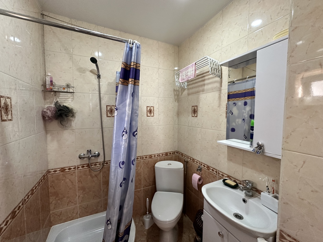 Гостиная объединена с кухней свой санузел.