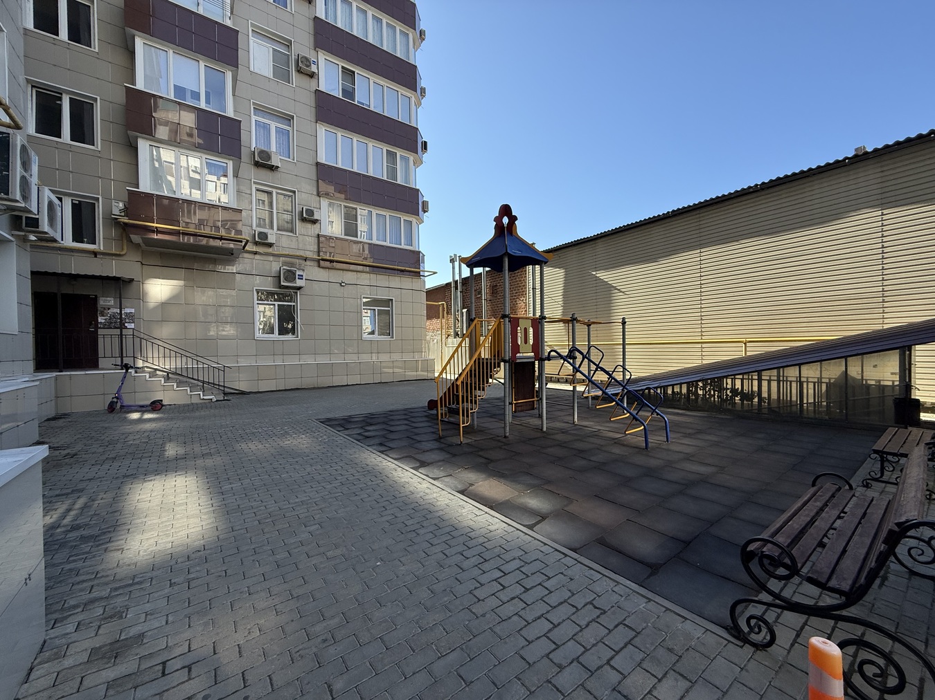 Закрытая территория двора с детской площадкой.