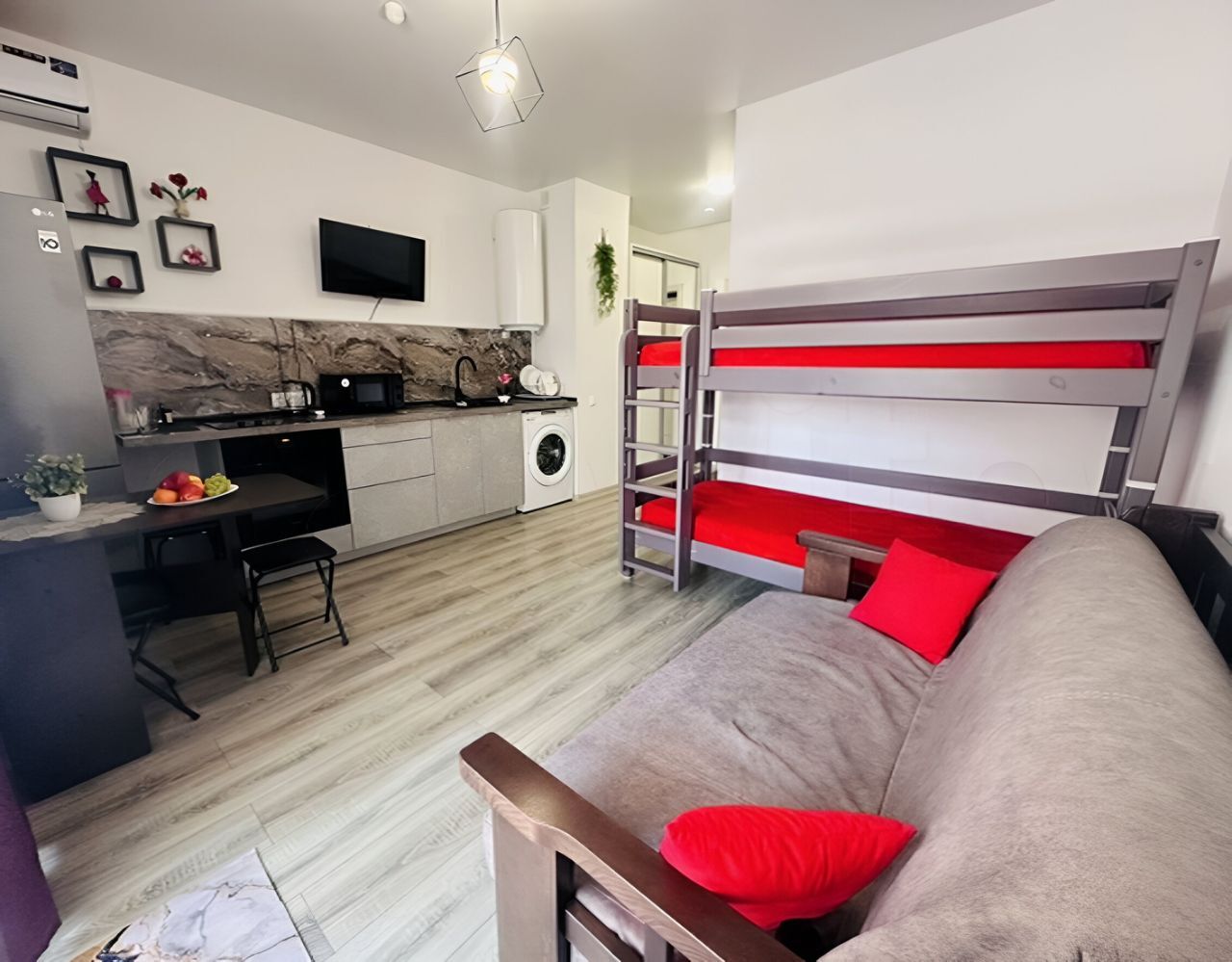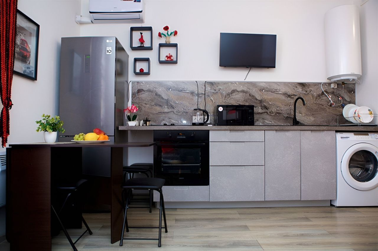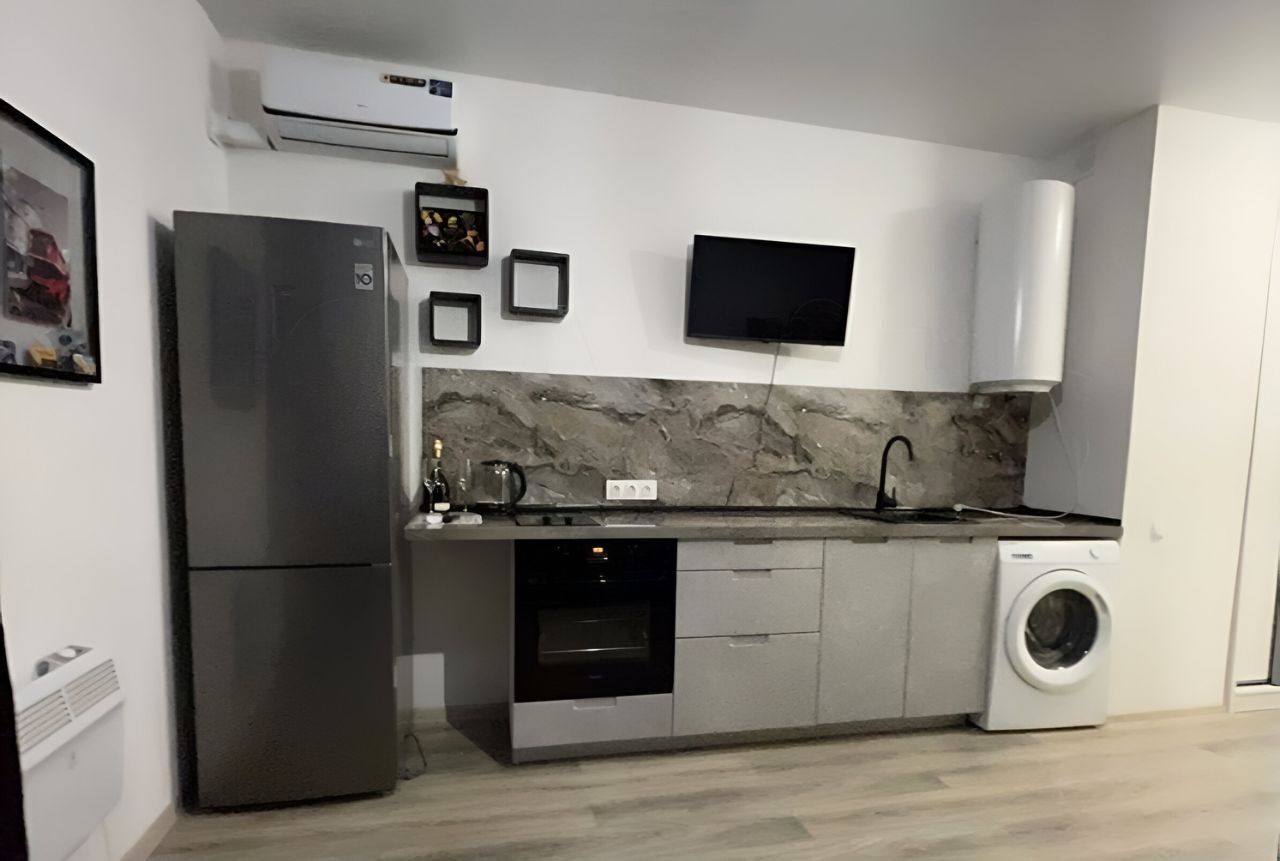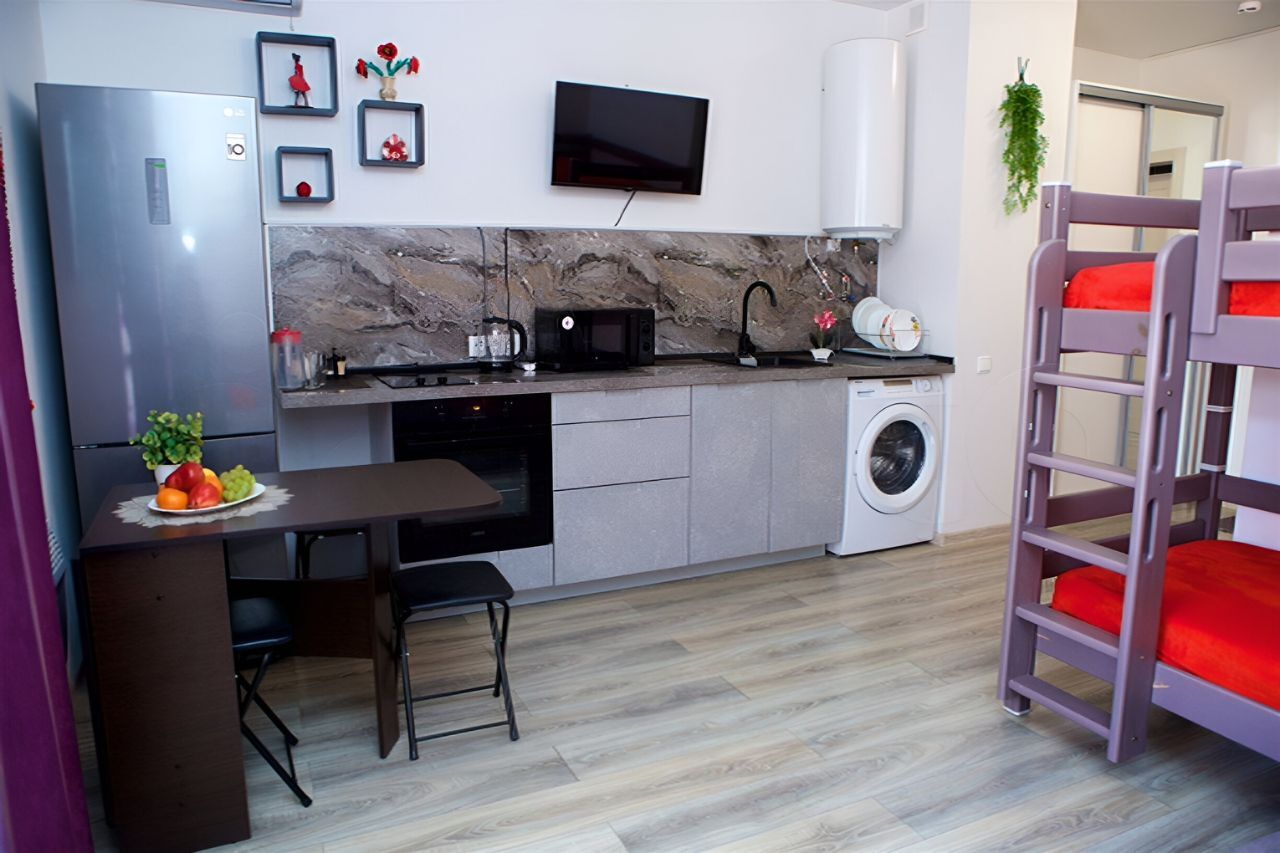 В студии есть все для комфортного проживания — необходимая мебель, большой холодильник, микроволновая печь, ТВ, роутер, стиральная машина, водонагреватель, эл. Плита, духовой шкаф, сплит система, посуда.