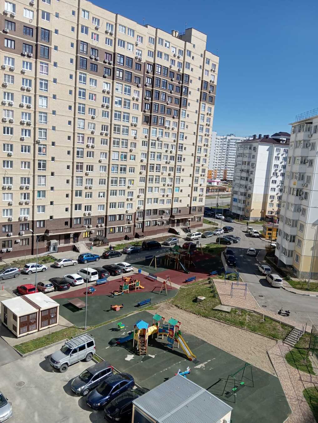 Уютный двор с детской площадкой и место для отдыха.