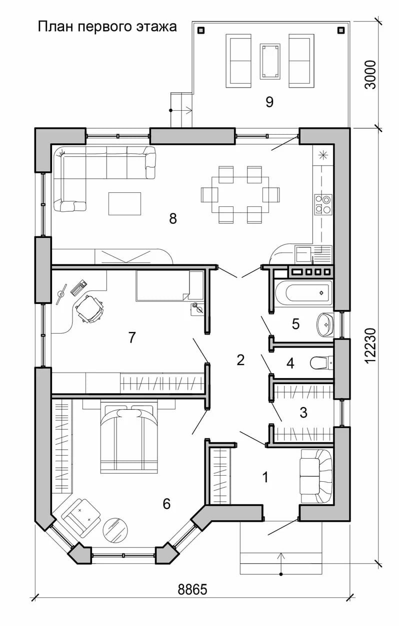 Отличная планировка дома -две спальни, просторная кухня - гостиная с выходом на террасу, санузел раздельный, бойлерная, гардеробная.