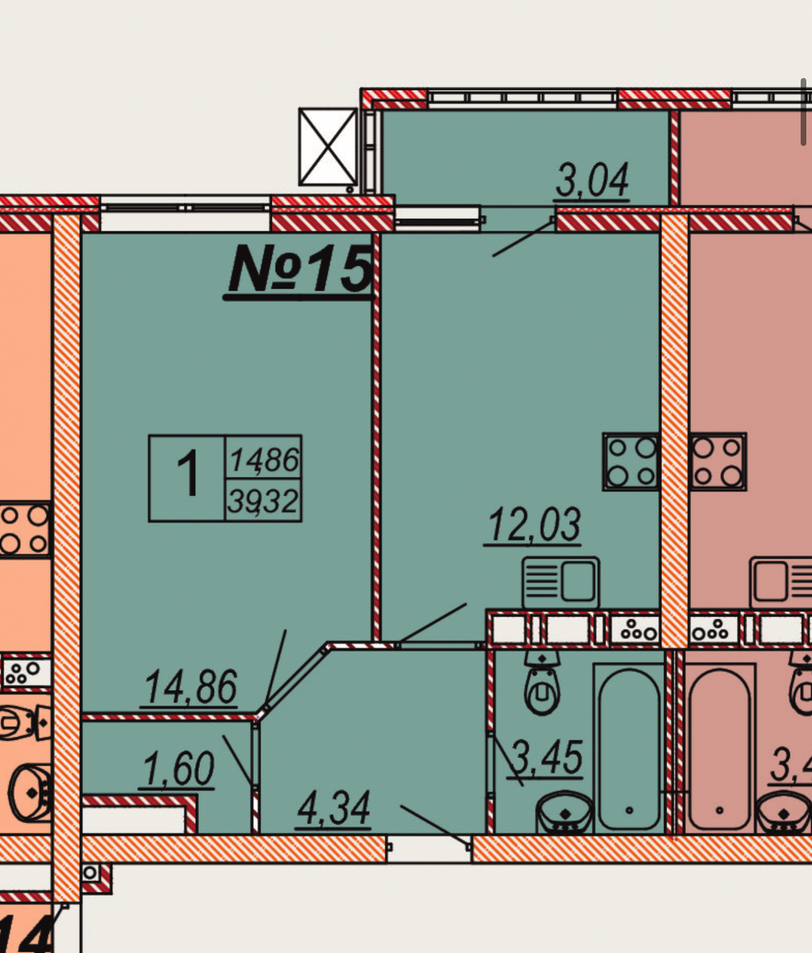 Площадь квартиры: 39,7 м² + лоджия 3,04 м²
