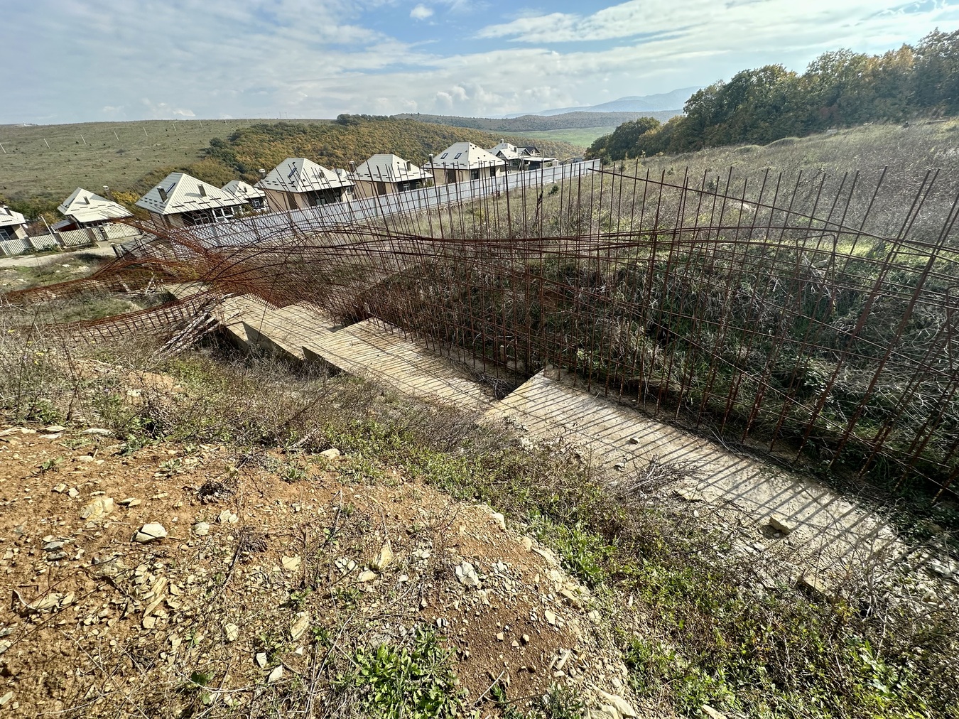 Участок каскадный, по периметру сделаны подпорные стены. На участке есть скважина, заведен свет!