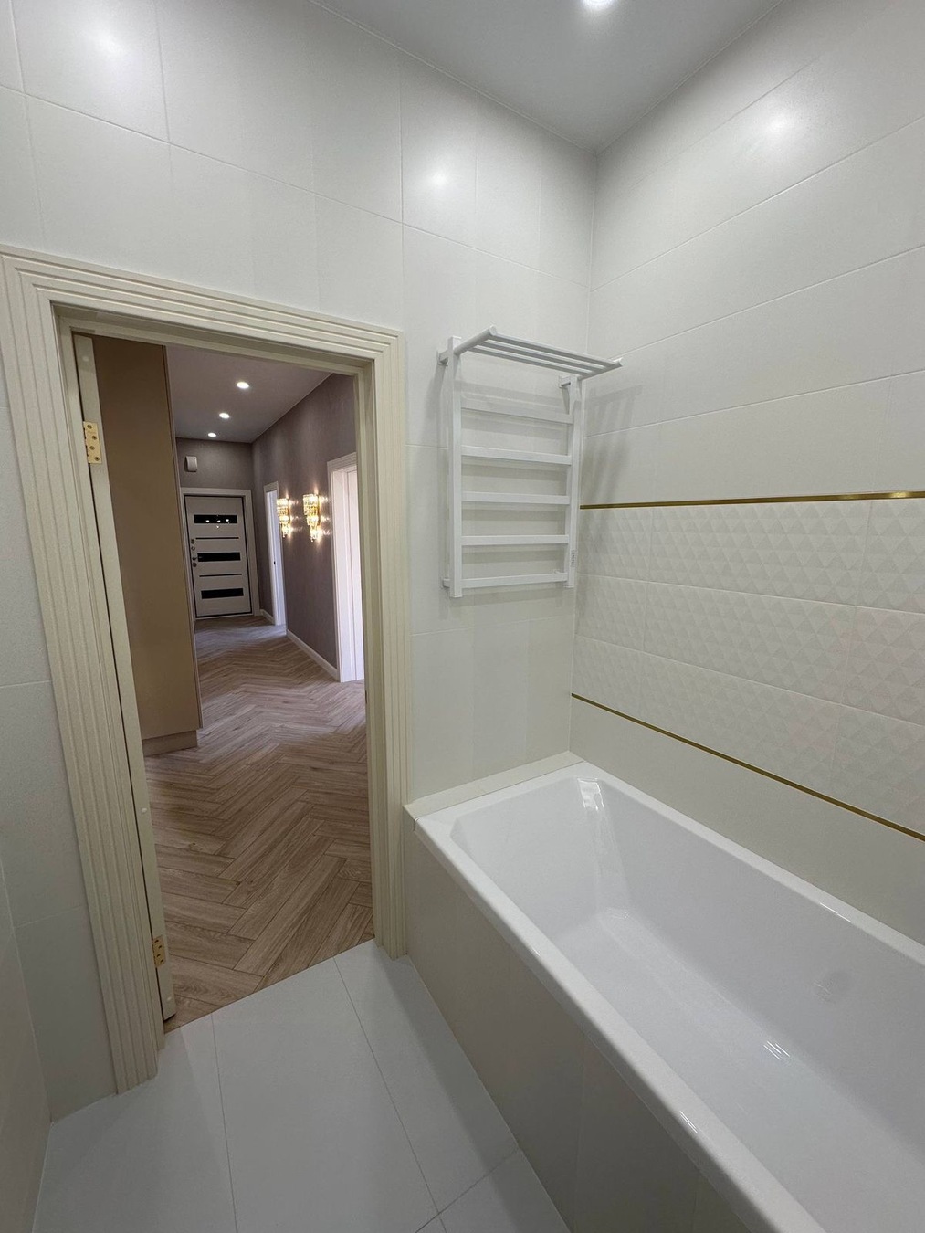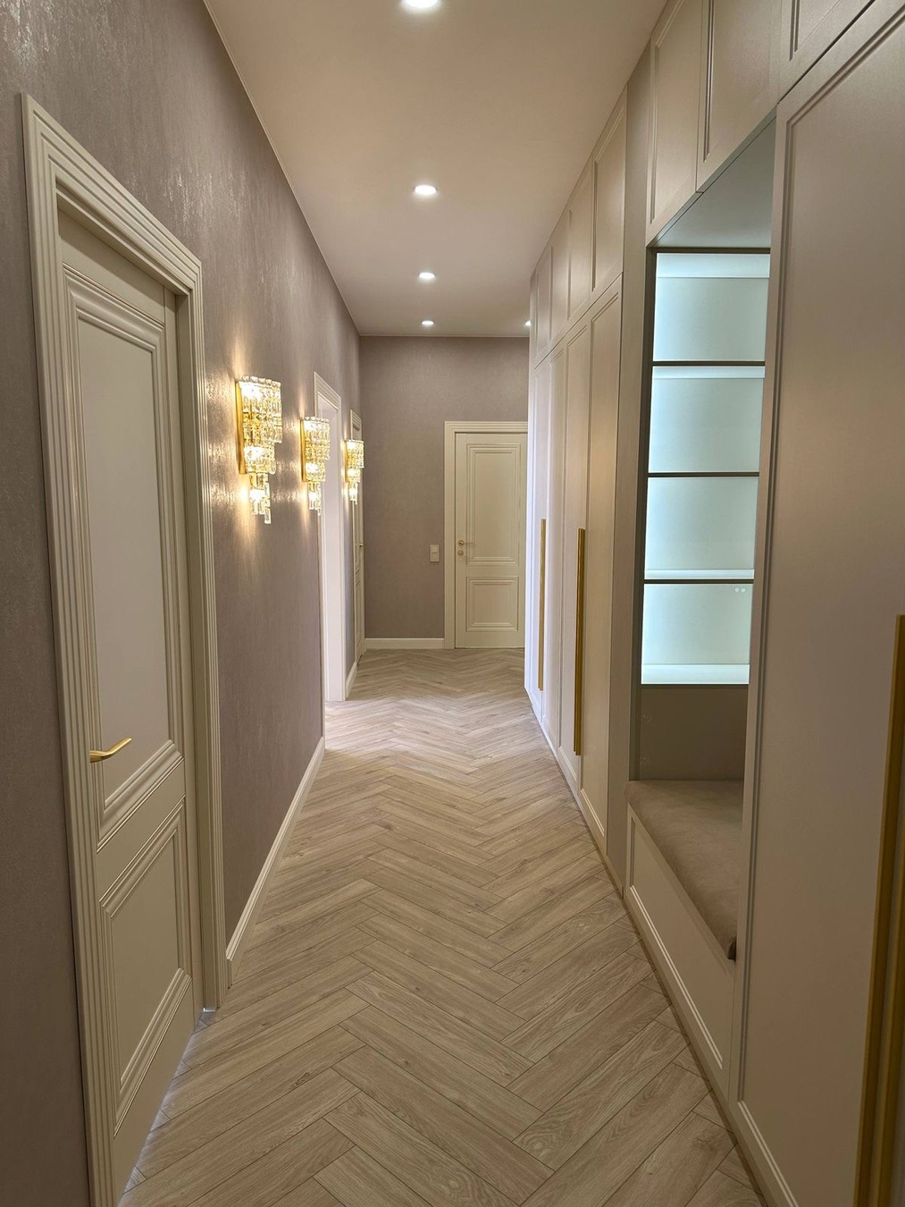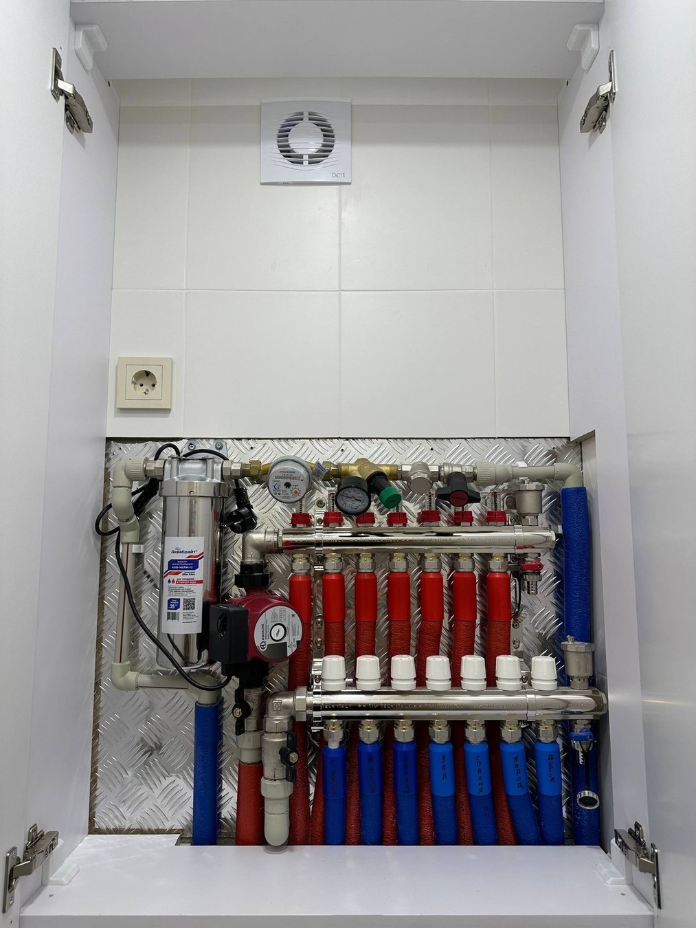- Без радиаторов — тёплый водяной пол по квартире; отопление каждой комнаты включается отдельно (экономия и комфорт).