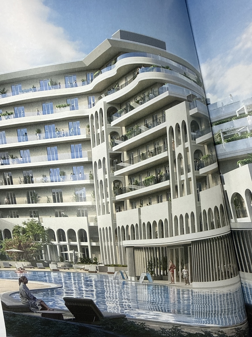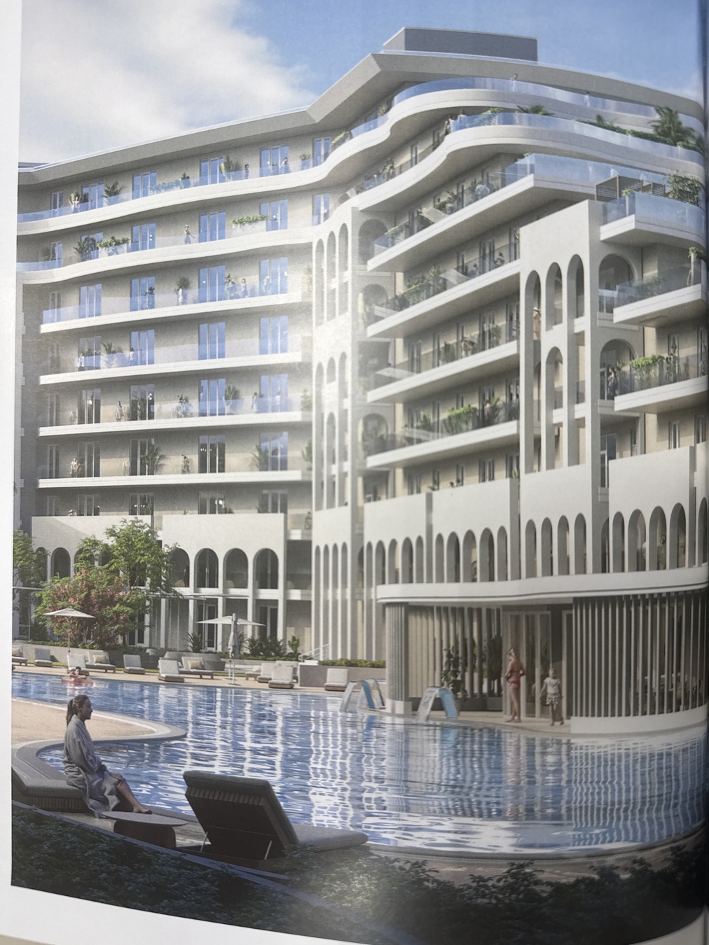На территории комплекса находятся четыре девятиэтажных каскадных здания, выполненных в светлых тонах