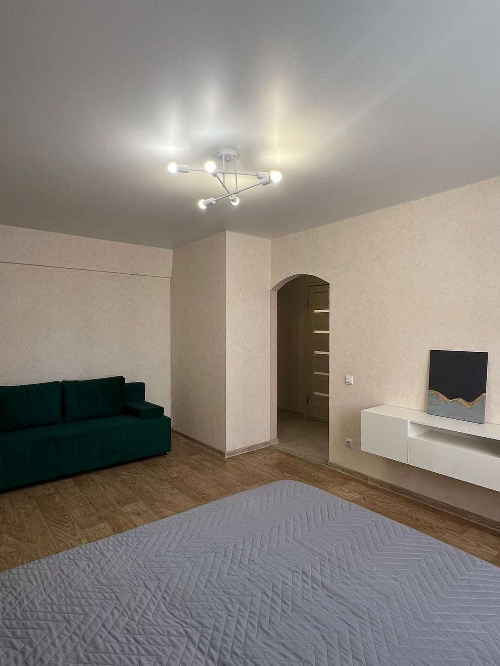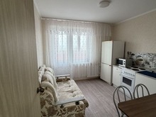 Квартира с удобной планировкой: просторная комната, кухня-гостиная с выходом на балкон, совмещенный санузел.