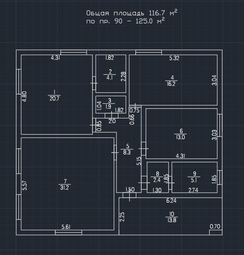 Просторная кухня-гостиная 31 м2, три спальни (одна 20м2 со своим санузлом), 16м2 и 13м2, санузел, котельная. Терраса 14м2.