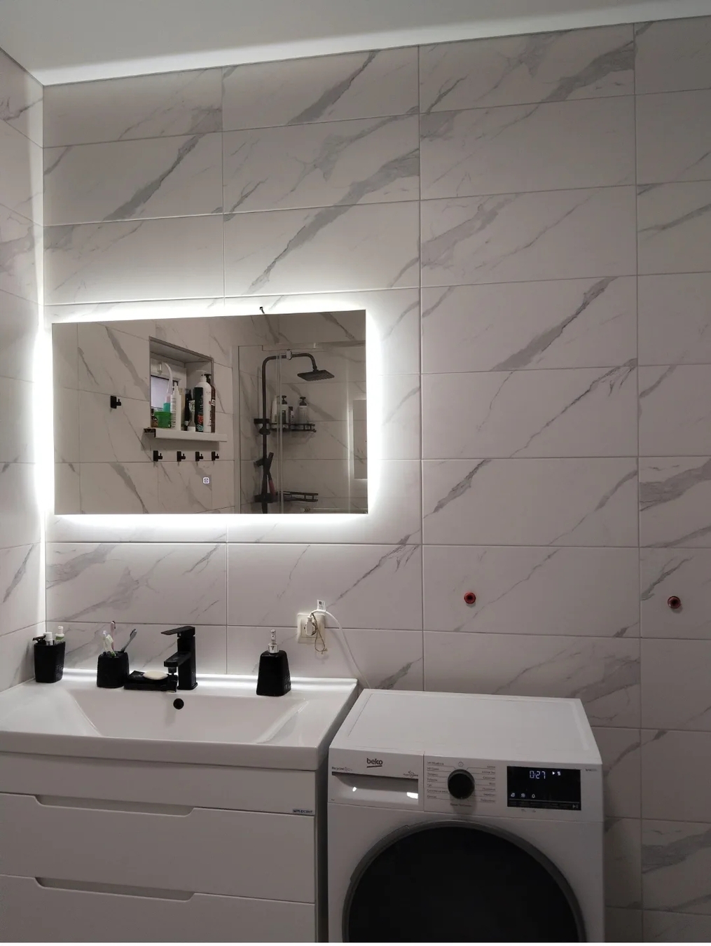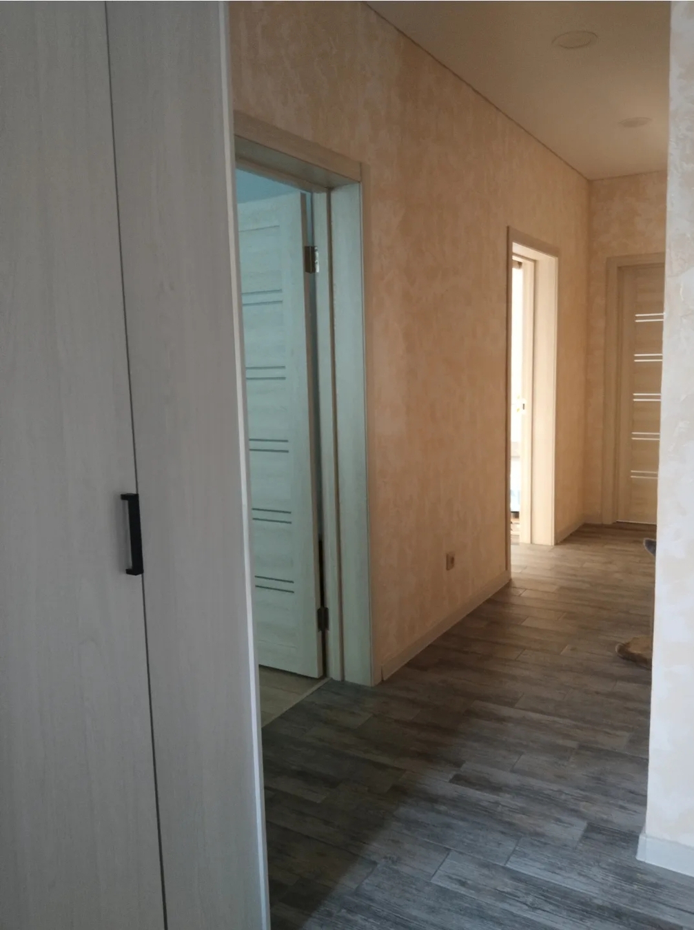 Теплые полы в кухне, коридоре, санузле (плитка), в комнатах ламинат.