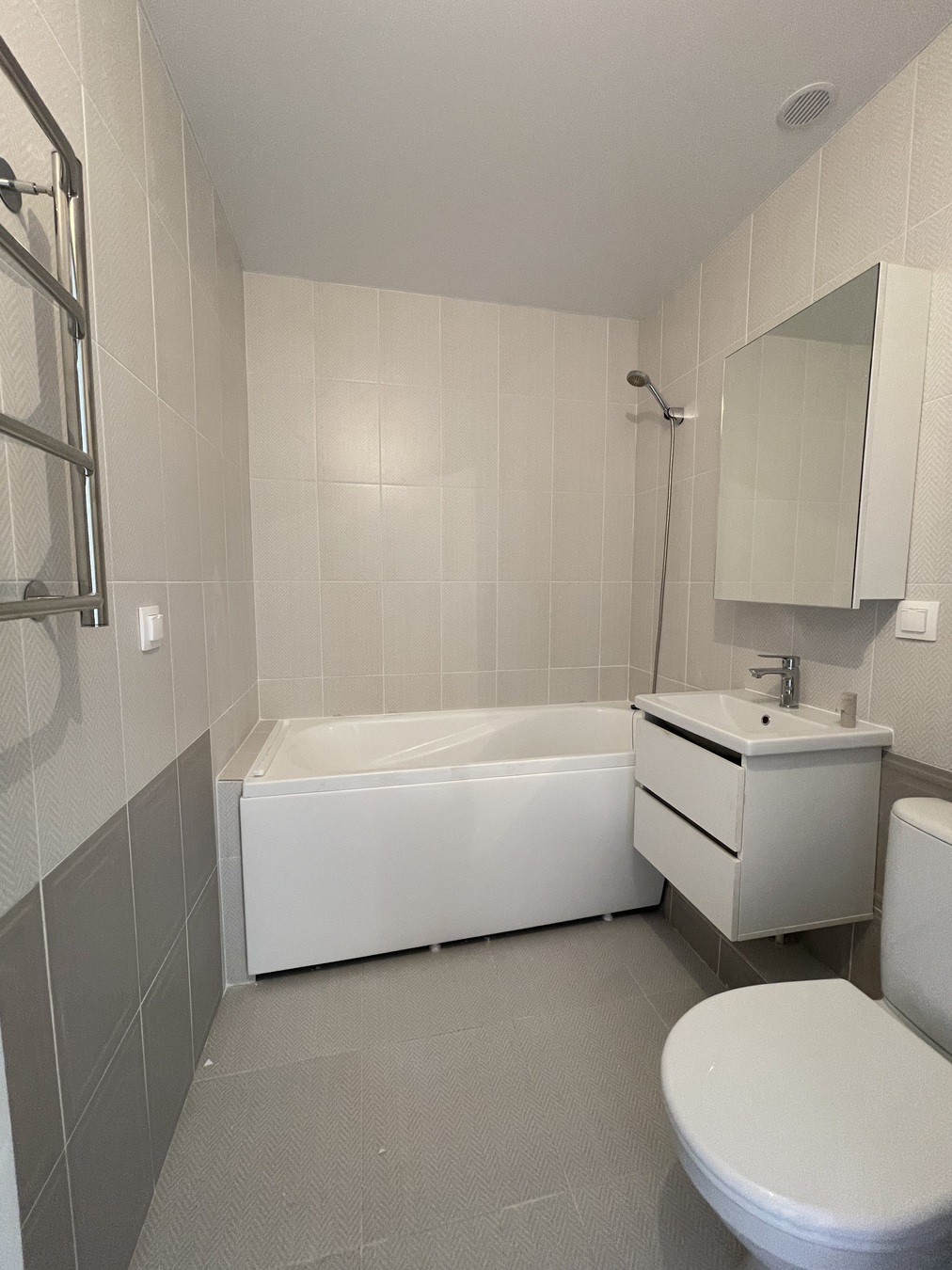 ✔️ Качественный ремонт: износостойкий ламинат, антивандальные обои под покраску, стильная керамическая плитка в санузле от Kerama Marazzi.