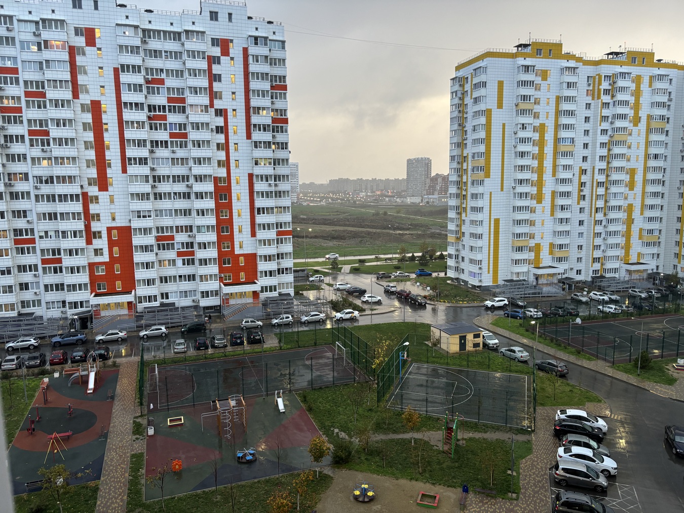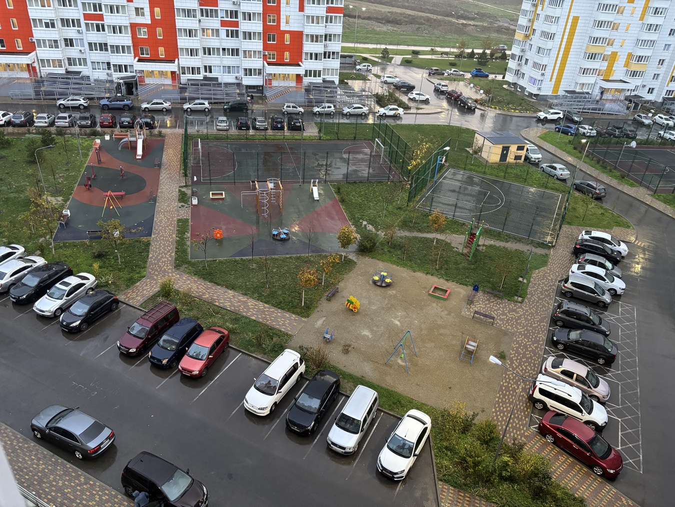 Во дворе игровые и спортивные площадки, достаточное количество парковочных мест.