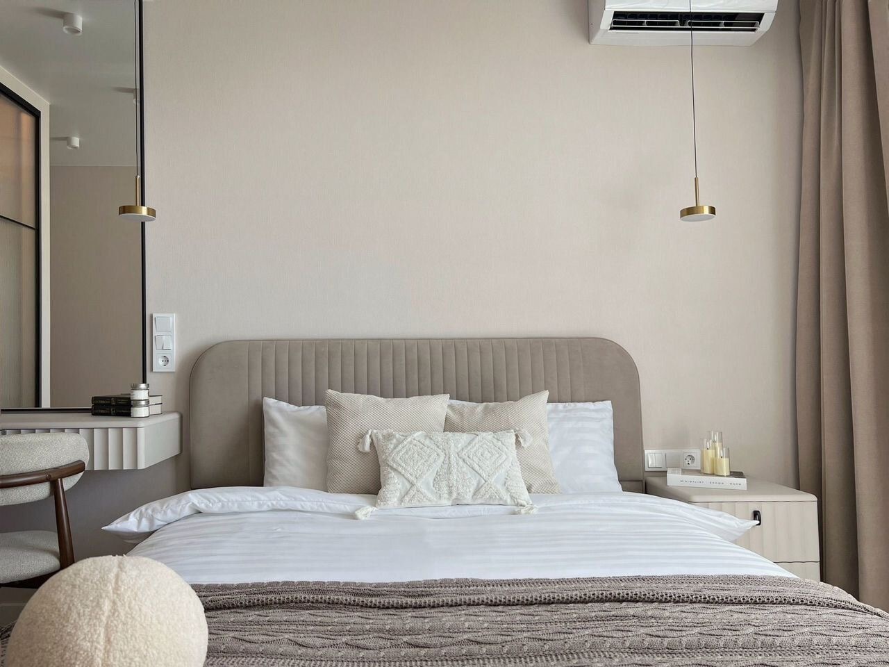 В спальне выделена гардеробная с шикарными стеклянными дверьми и внутренней подсветкой, благодаря рельефу стекла и матовой основе, внутреннего наполнения гардеробной не видно, оно максимально размывается. Большая двухспальная кровать с подъемным механизмом. Проходные выключатели над тумбами для максимального удобства.