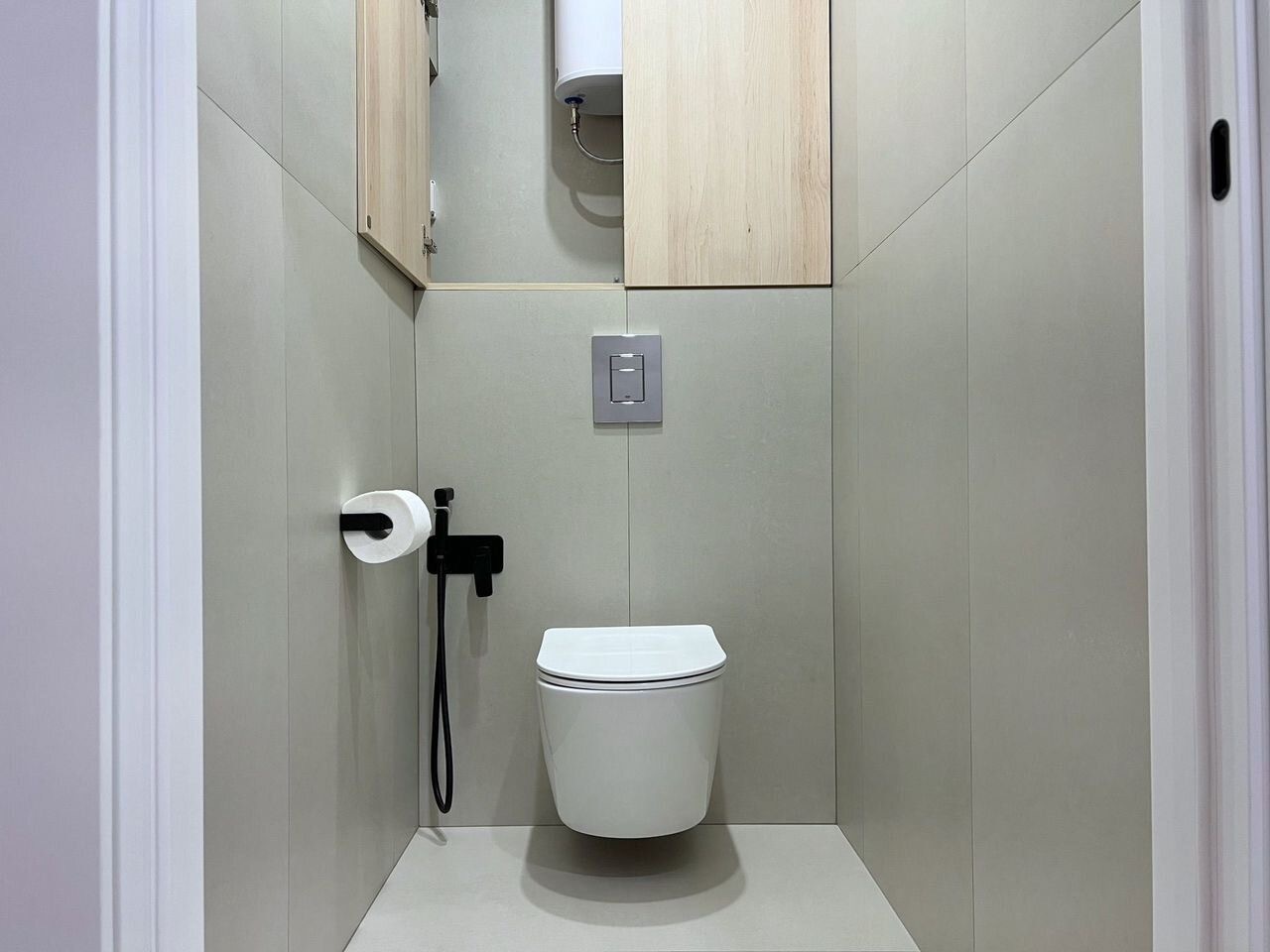Раздельный санузел. В туалете установлена инсталляция с подвесным унитазом, над которым расположен большой шкаф для хранения, а так же там разместились водонагреватель/ датчики протечки/счетчики.