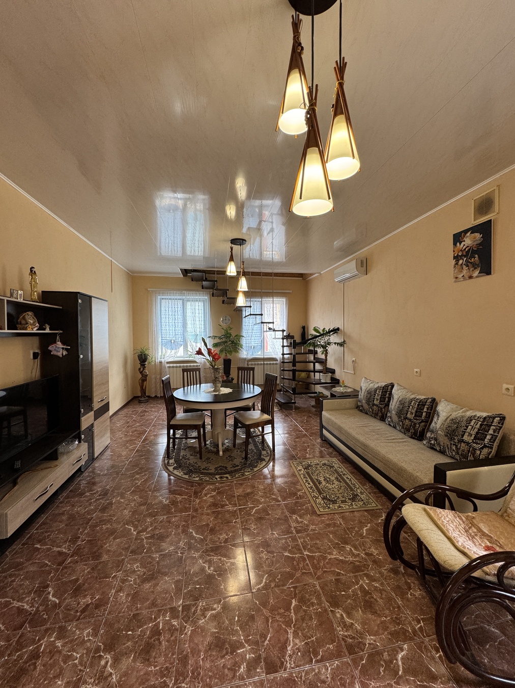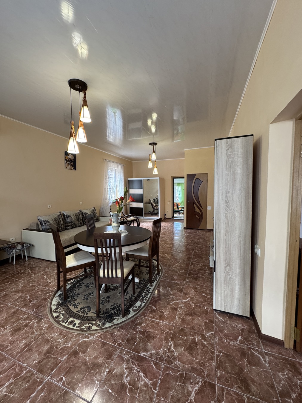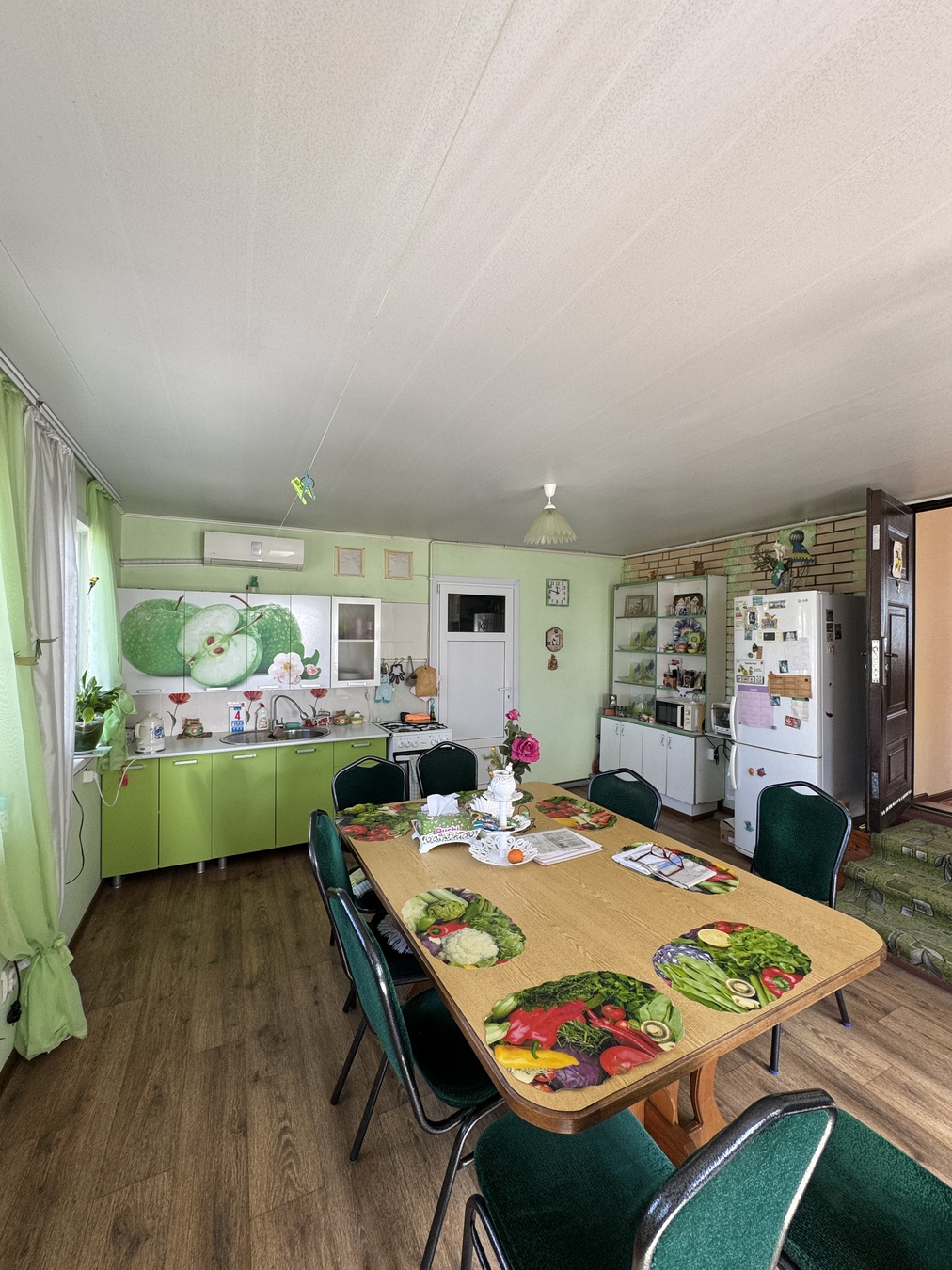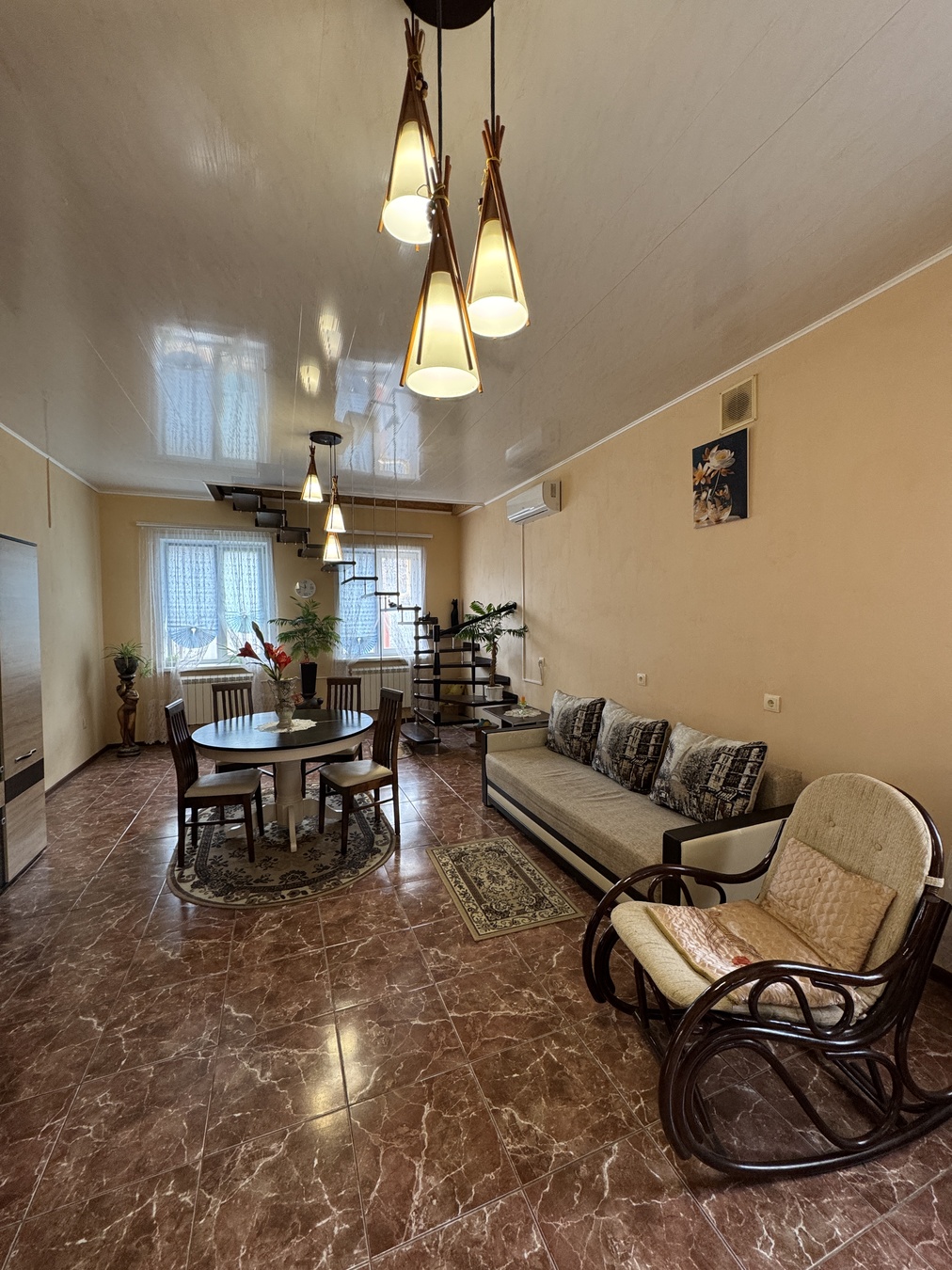 Большая кухня столовая, зал с высокими потолками ,на первом этаже две раздельных спальни и на втором этаже 2 раздельных спальни.