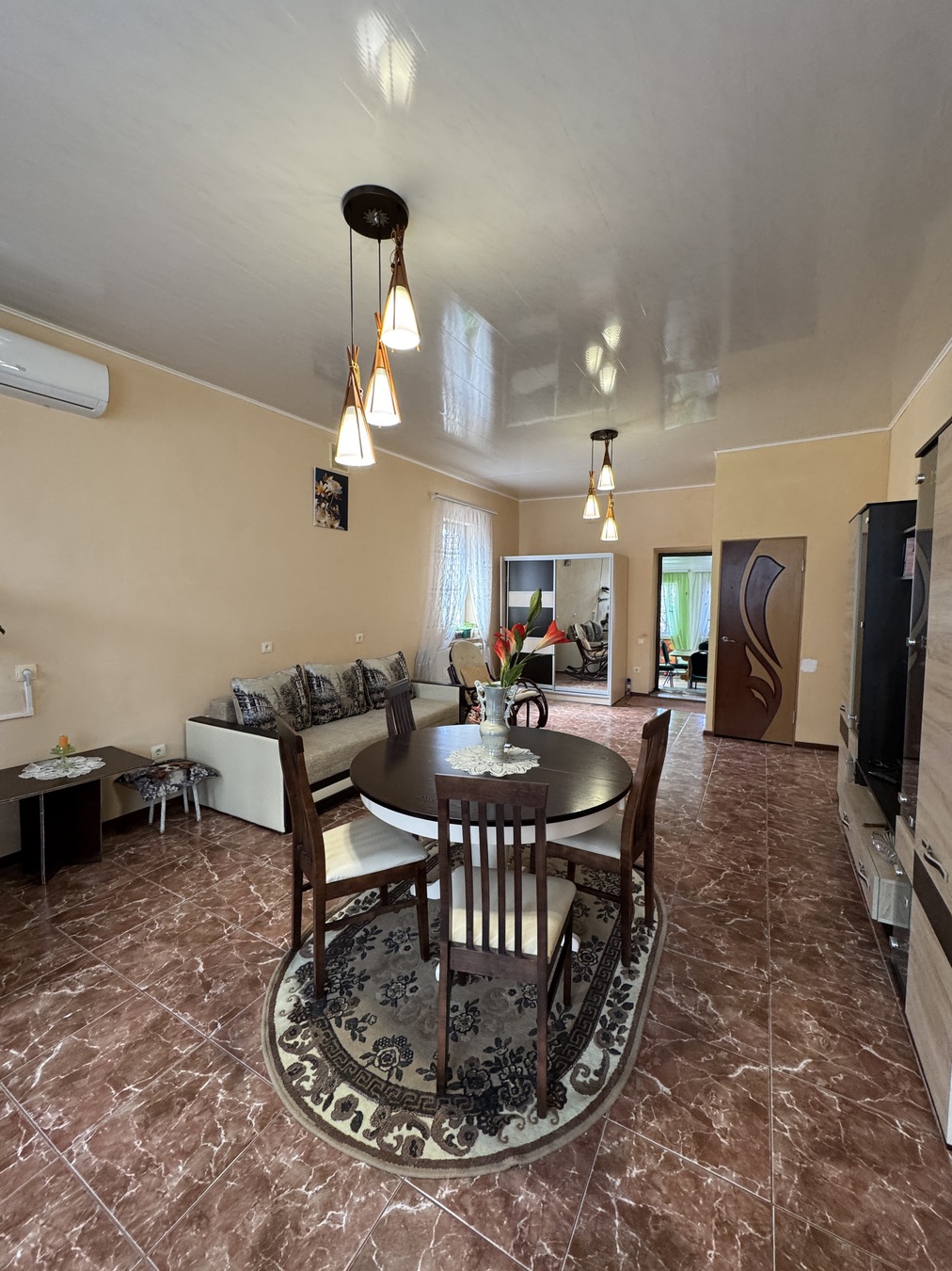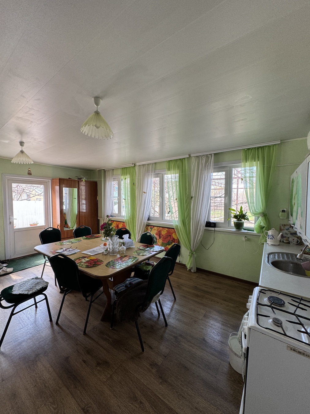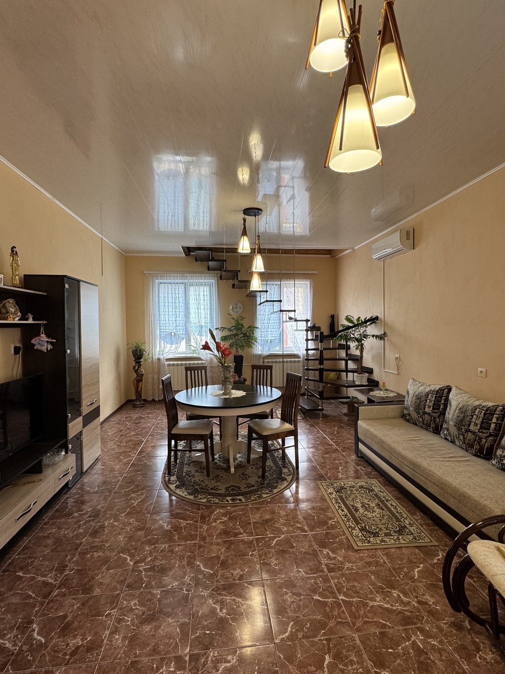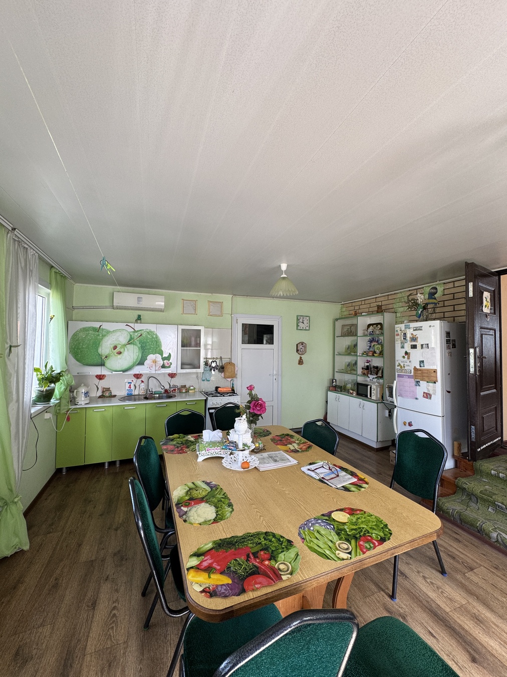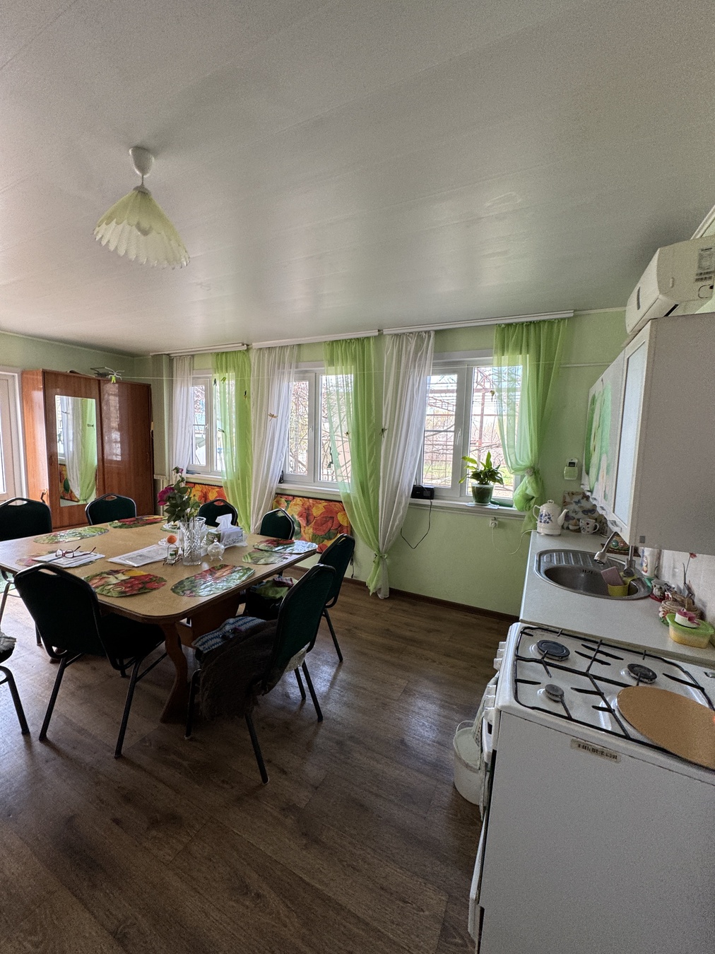 Большая кухня столовая, зал с высокими потолками ,на первом этаже две раздельных спальни и на втором этаже 2 раздельных спальни.