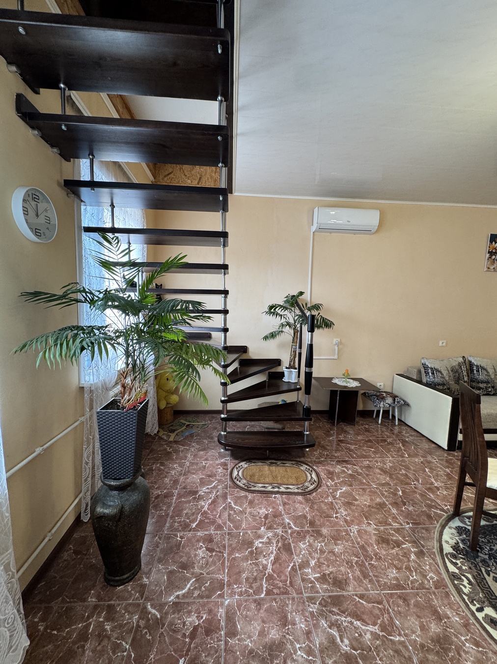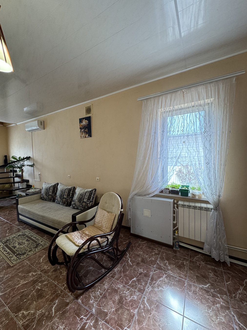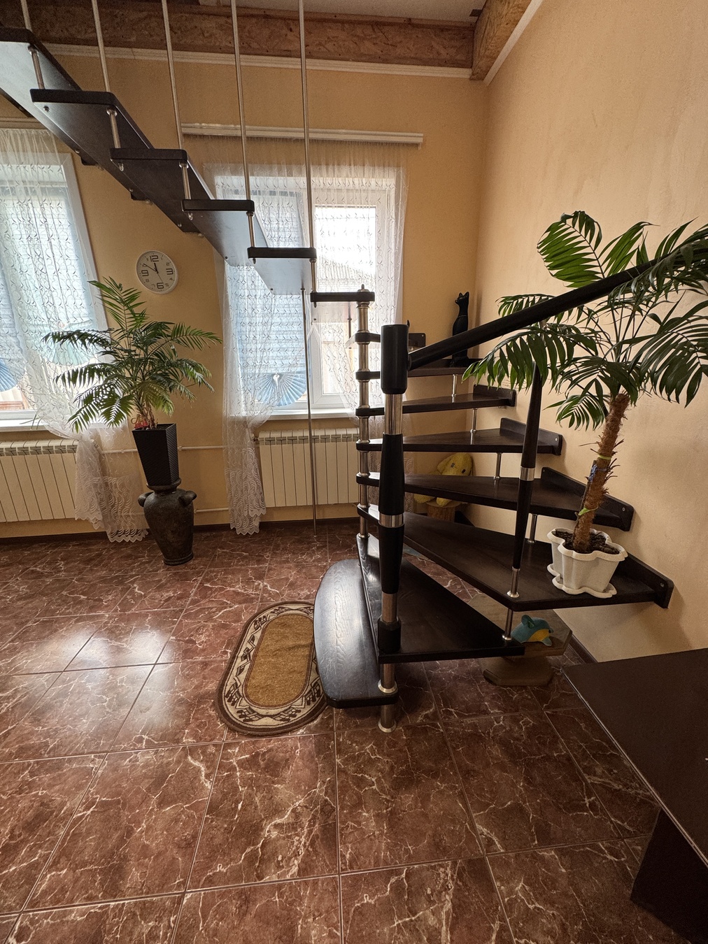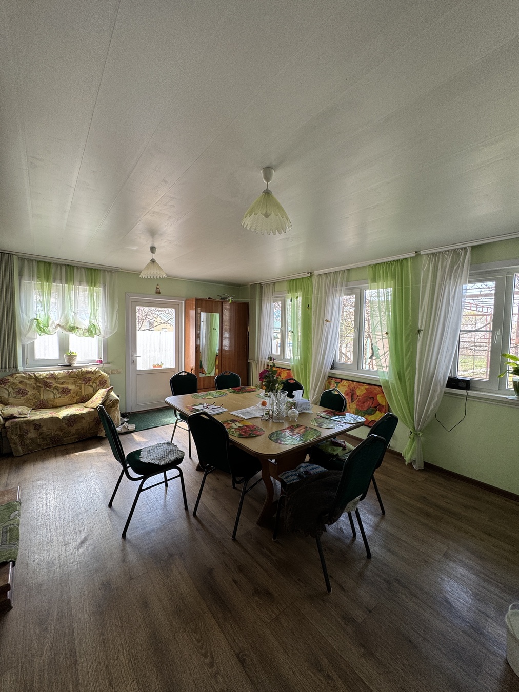 Большая кухня столовая, зал с высокими потолками ,на первом этаже две раздельных спальни и на втором этаже 2 раздельных спальни.