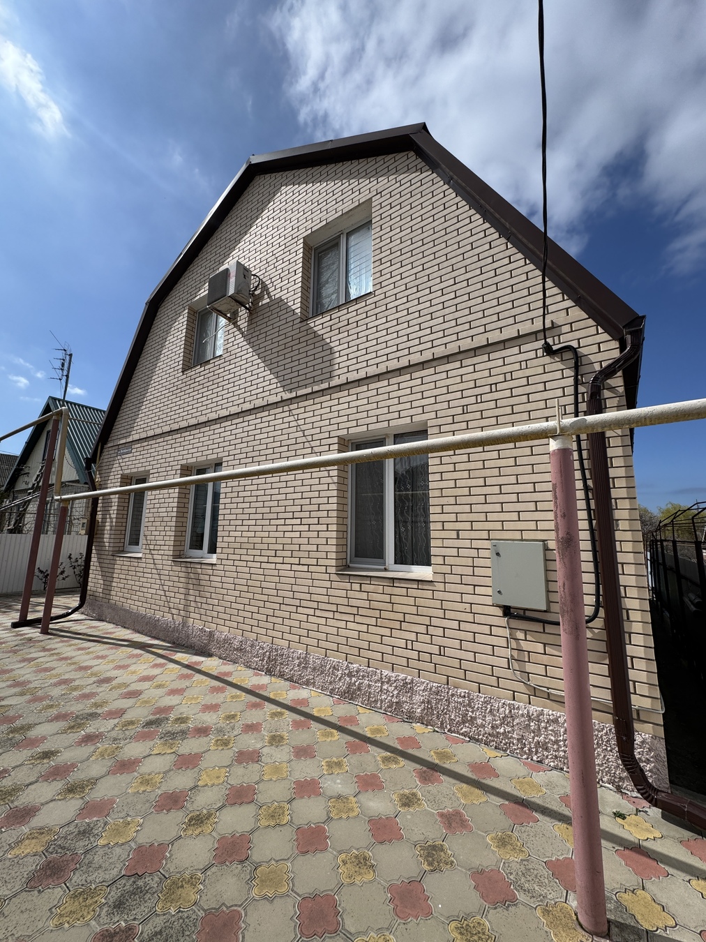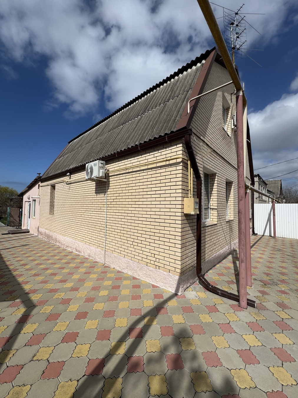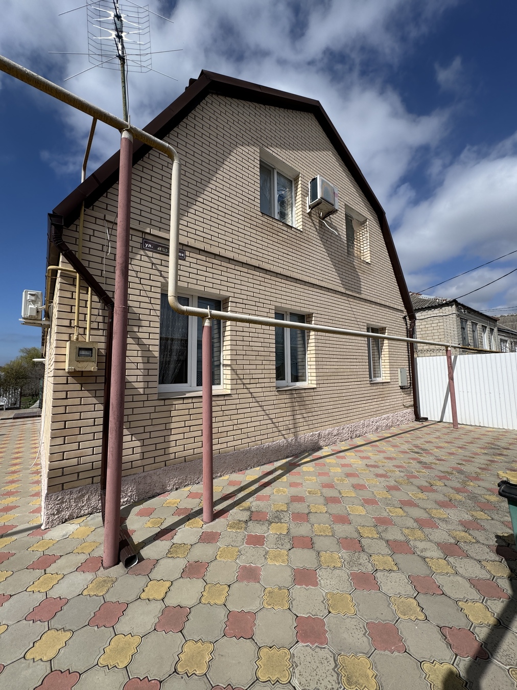 дом кирпичный, вокруг дома выложена плитка. Забор по периметру всего участка.