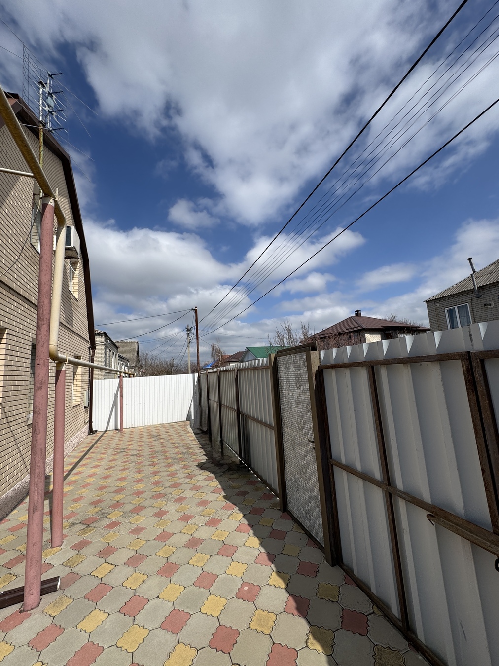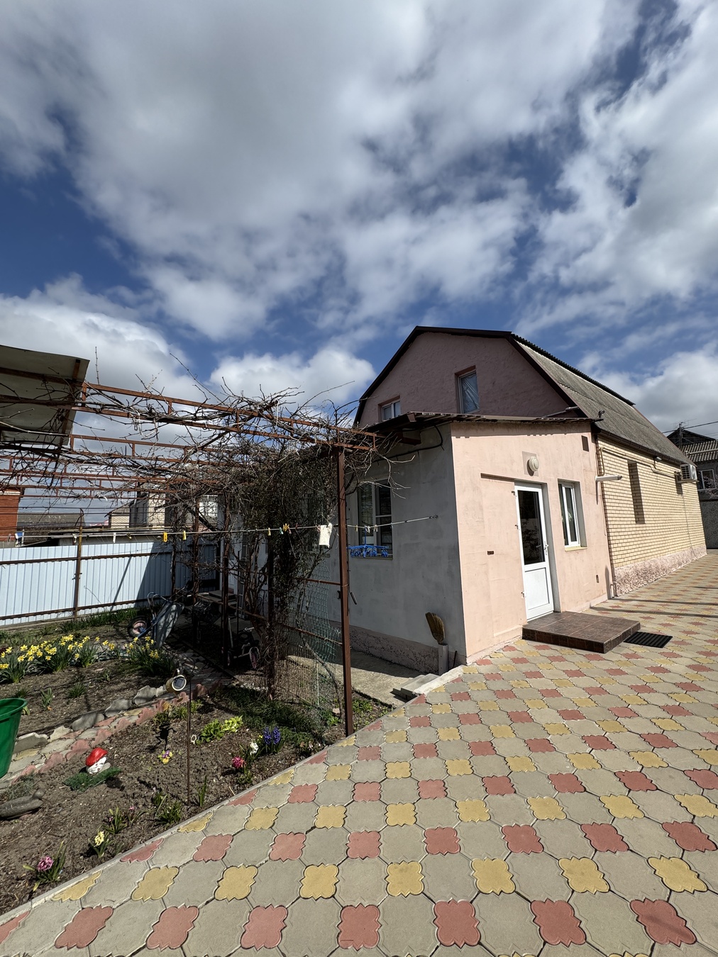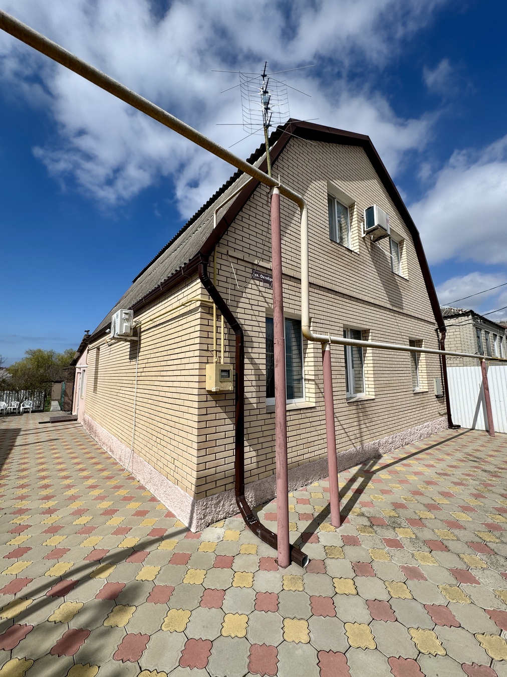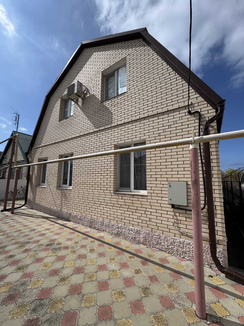 дом кирпичный, вокруг дома выложена плитка. Забор по периметру всего участка.