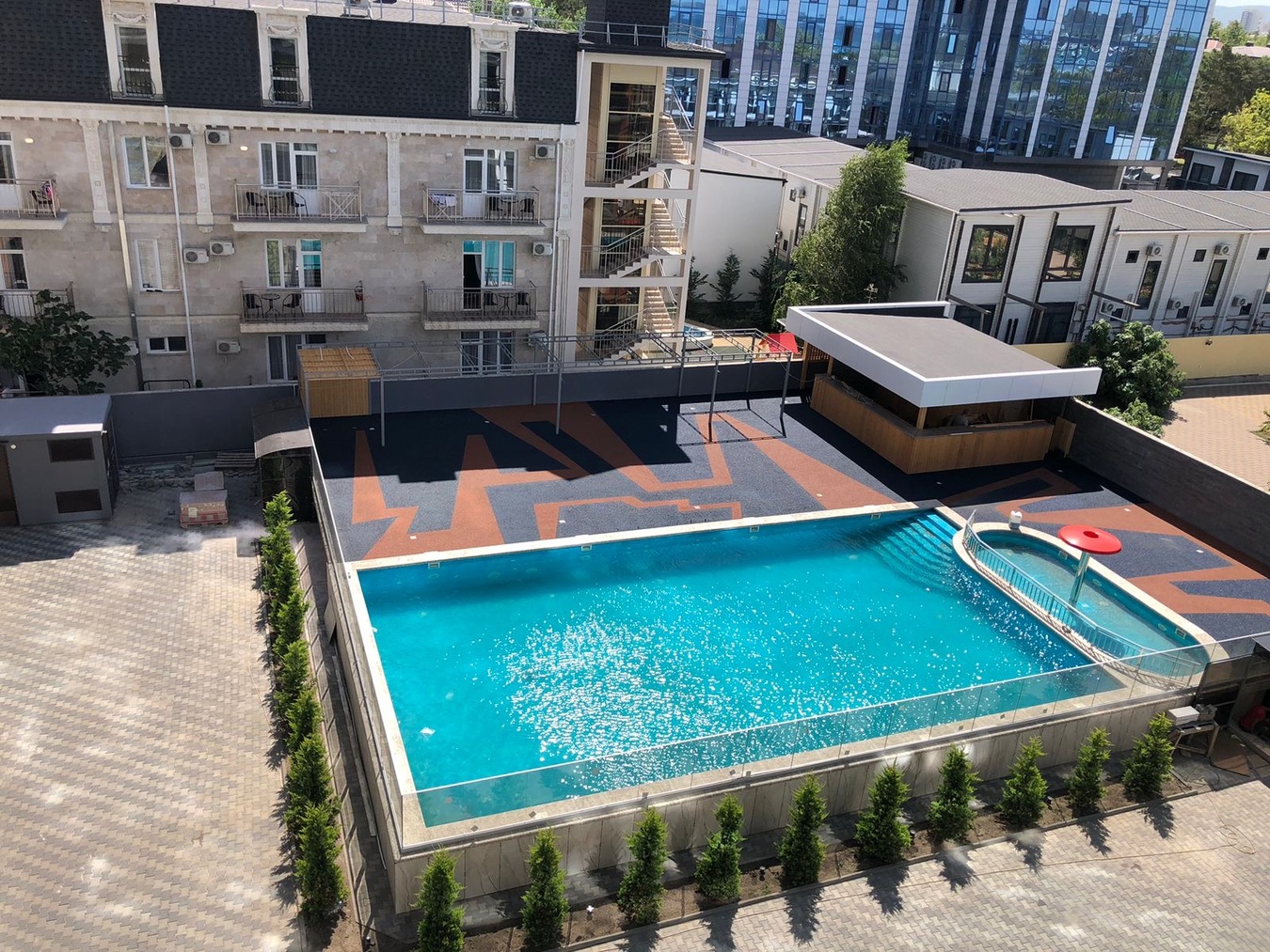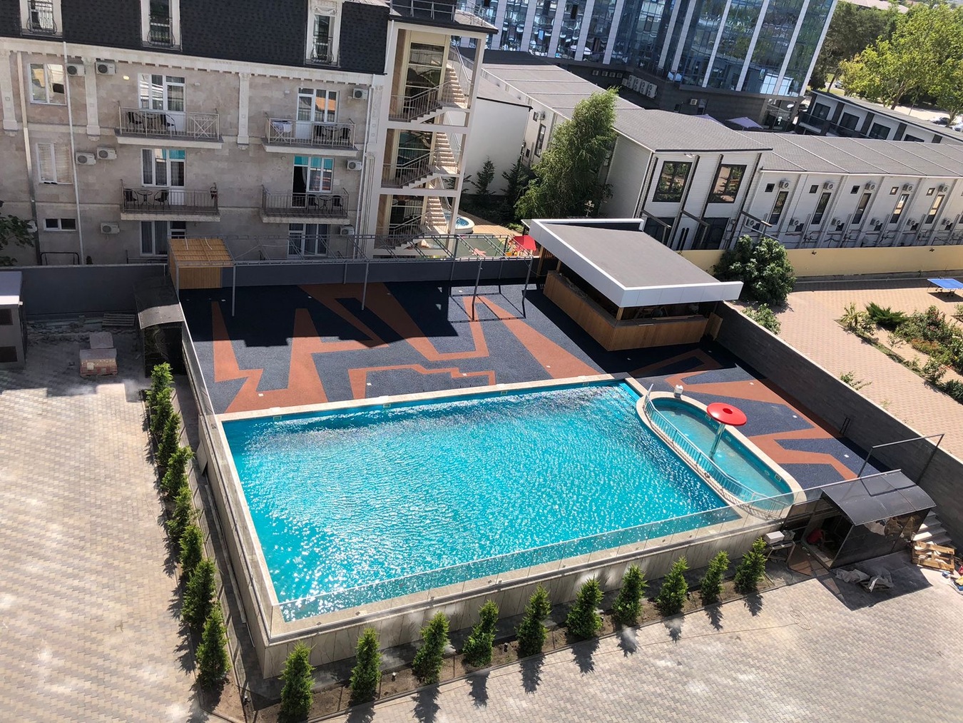На территории комплекса большой бассейн с подогревом для взрослых, детская чаша, зон отдыха с шезлонгами, детская площадка.
