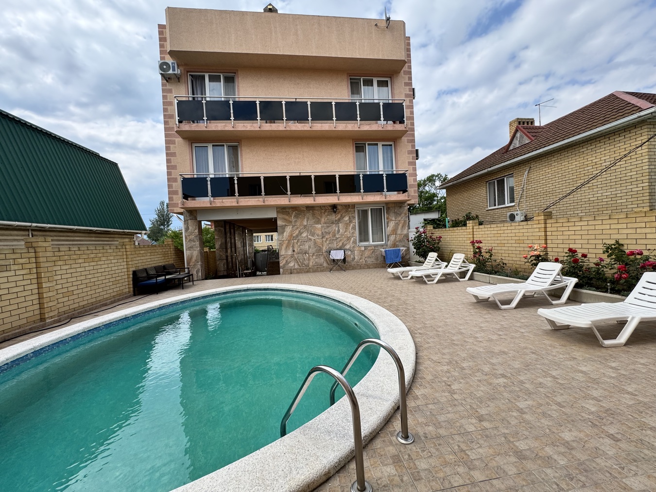 Свой закрытый двор, где есть подогреваемый бассейн с зоной отдыха и мангалом.