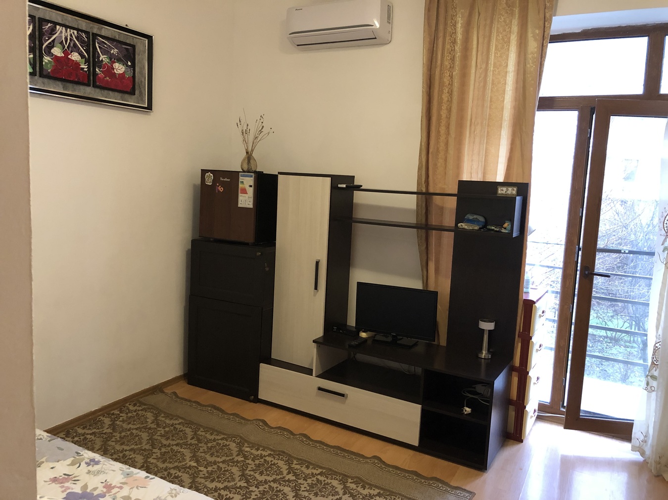 Уютная сoлнечнaя студия в капитальном доме с закрытой территорией. В студии есть все для жизни. Бытовая техника, мини кухня, совмещенный сан узел, кондиционер, спальное место и панорамные окна при выходе на свой балкон. Вид с балкона открывается на начало кавказских гор покрытых можжевеловым лесом. Балкон не стандартный большого размера. Отопление в доме за счет электричества.