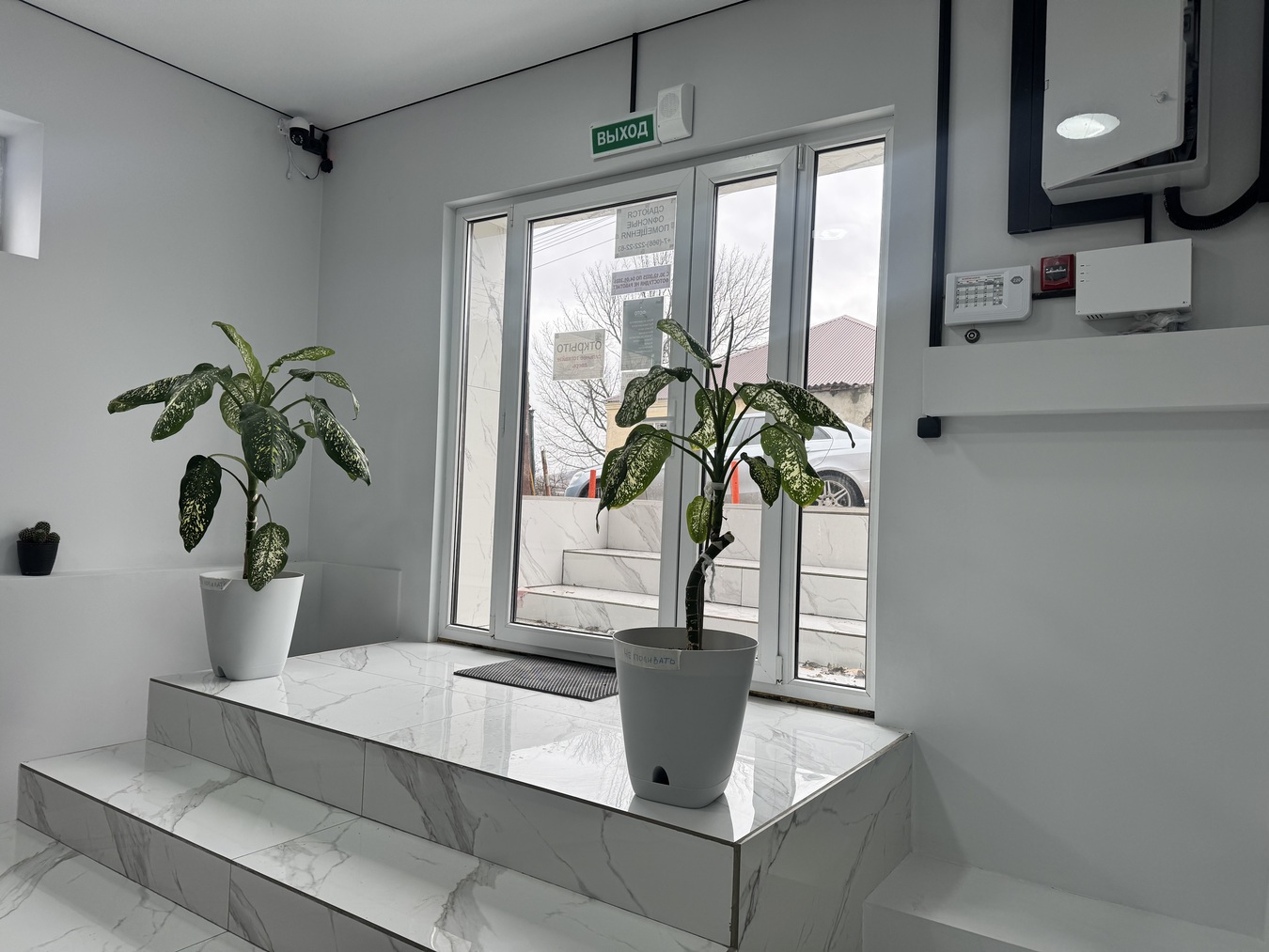 стены окрашены, на полу кафель, потолок натяжной, качественные двери, МПО, много точек освещения, объект находится под охраной. Входная группа мебелирована. Видео-наблюдение, интернет.
