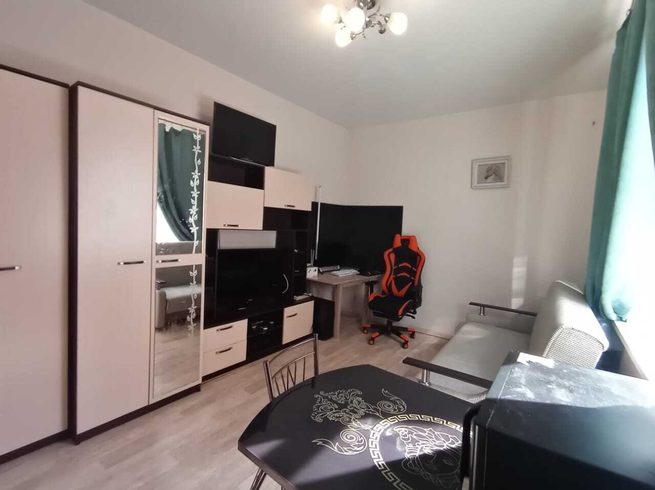 Студия находится в малоэжтажном доме. Окна на тихую сторону.На первом этаже магазин.
