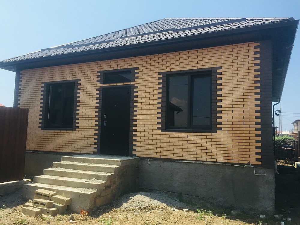 Дом стоит на ленточном фундаменте.Стены керамзито-бетонный блок фасад кирпич.